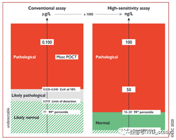 高敏肌钙蛋白(hs-cTn)——心肌细胞损伤的定量标志物 所有疑似 NSTE-ACS 的患者都必须测定提示心肌细胞损伤的生物标志物,首选 hs-cTn。 通过高敏肌钙蛋白检测并不能诊断MI,但可除外MI,可在 MI 的早期诊断中提供可观的诊断准确性。 除 MI 外,许多其他心脏疾病也会引起心肌细胞损伤,导致肌钙蛋白升高。 另外,指南推荐对于可疑NSTE-ACS 患者使用hs-cTn检测的 0h/1h或0h/2h方案 “排除”和“纳入”方案,时间间隔的缩短,大大减少了诊断时间的延迟,从而缩短患者在急诊室的停留时间并降低成本。 作为替代方案,可以考虑之前欧洲心脏病学会(ESC)提出的0h/3h方案. 除诊断作用外,还建议通过连续的 hs –cTn 检测评估预后; 尽管高敏肌钙蛋白 T(hs-cTn-T)和hs-cTn-I 诊断准确性相当,但 hs-cTn-T 的预后价值更大。