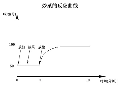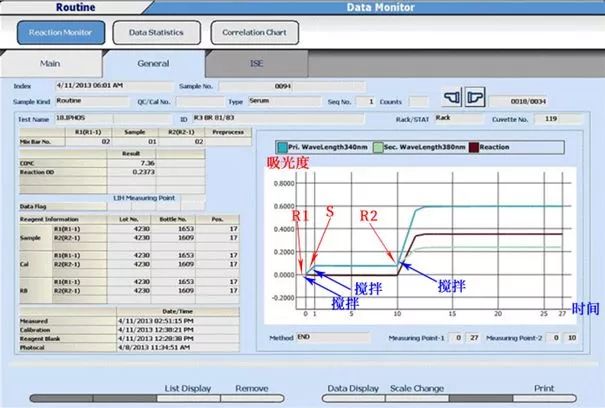 1.反应曲线是什么? 炒菜,应该大家都会吧? 其实,生化项目的检测过程跟炒菜比较相似,炒菜的基本流程是:放油→放菜→放盐,如果每隔18秒,对菜的味道进行打分并记录,再把各个点连接绘成一条曲线的话,炒菜的反应曲线大致是这样的,见下图: 如果只是把油→菜→盐,按顺序放进锅里,这一锅菜应该是没法吃的,对吧?至少得在放油、菜、盐的时候用锅铲搅拌混匀一下,对吧?于是炒菜的反应曲线变成了这样,见下图: 那么,对应的生化项目检测(以奥林巴斯AU系列为例)是这样的:首先,仪器会向反应杯加入试剂1(R1),紧接着加入样本(S), 搅拌混匀,3分钟后加入试剂2(R2),搅拌混匀。在这个过程中,仪器会每隔18秒测试一次吸光度并记录,总共28(0-27)个点,然后连接成线,就是我们所看到的反应曲线,见下图: 所以,反应曲线是项目检测整个过程的记录,相当于是一个静态的录像。 2.反应曲线怎么看?