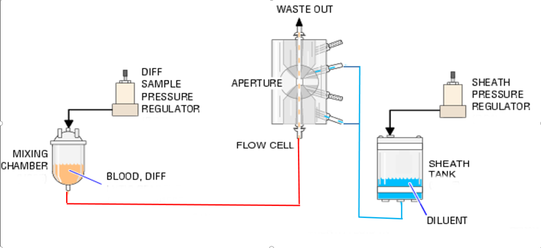 白细胞五分类的液路包含三个核心的部件:混匀池(mixing chamber)、鞘液罐(Sheath Tank)、流动池(Flowcell)。