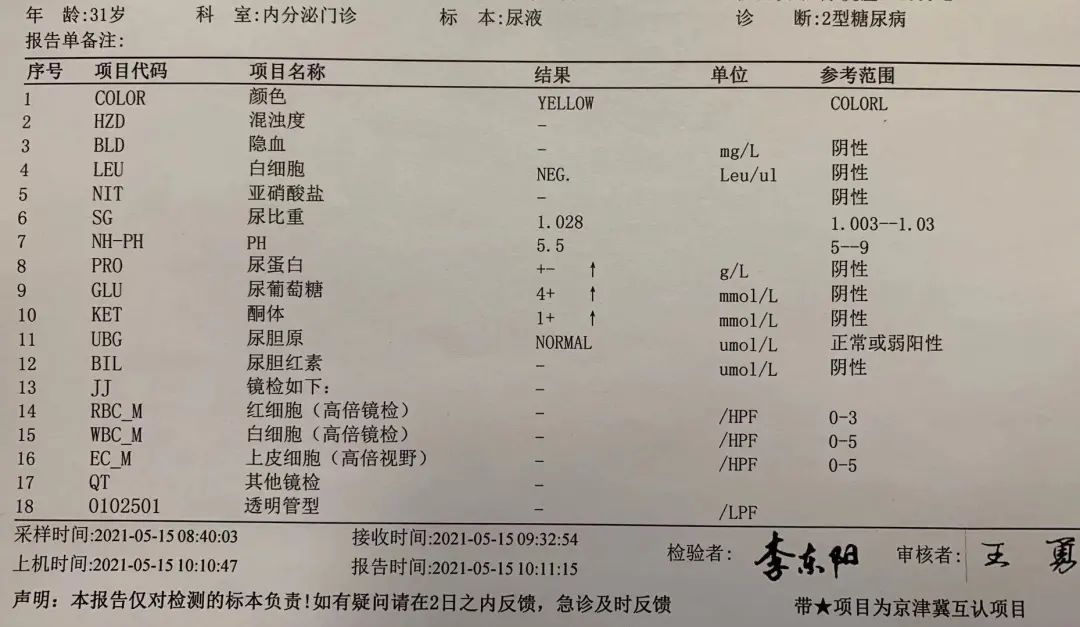 31岁的小刘,前几天陪老婆做产检,凑热闹也测了一下血糖,空腹血糖15mmol/L。他不相信,就到医院做了糖耐量试验,结果空腹血糖13.2mmol/L,餐后2小时血糖18.8mmol/L,糖化血红蛋白7.9%,胰岛素高分泌,尿糖4+,尿酮体1+,尿微量蛋白143.46mg/L。