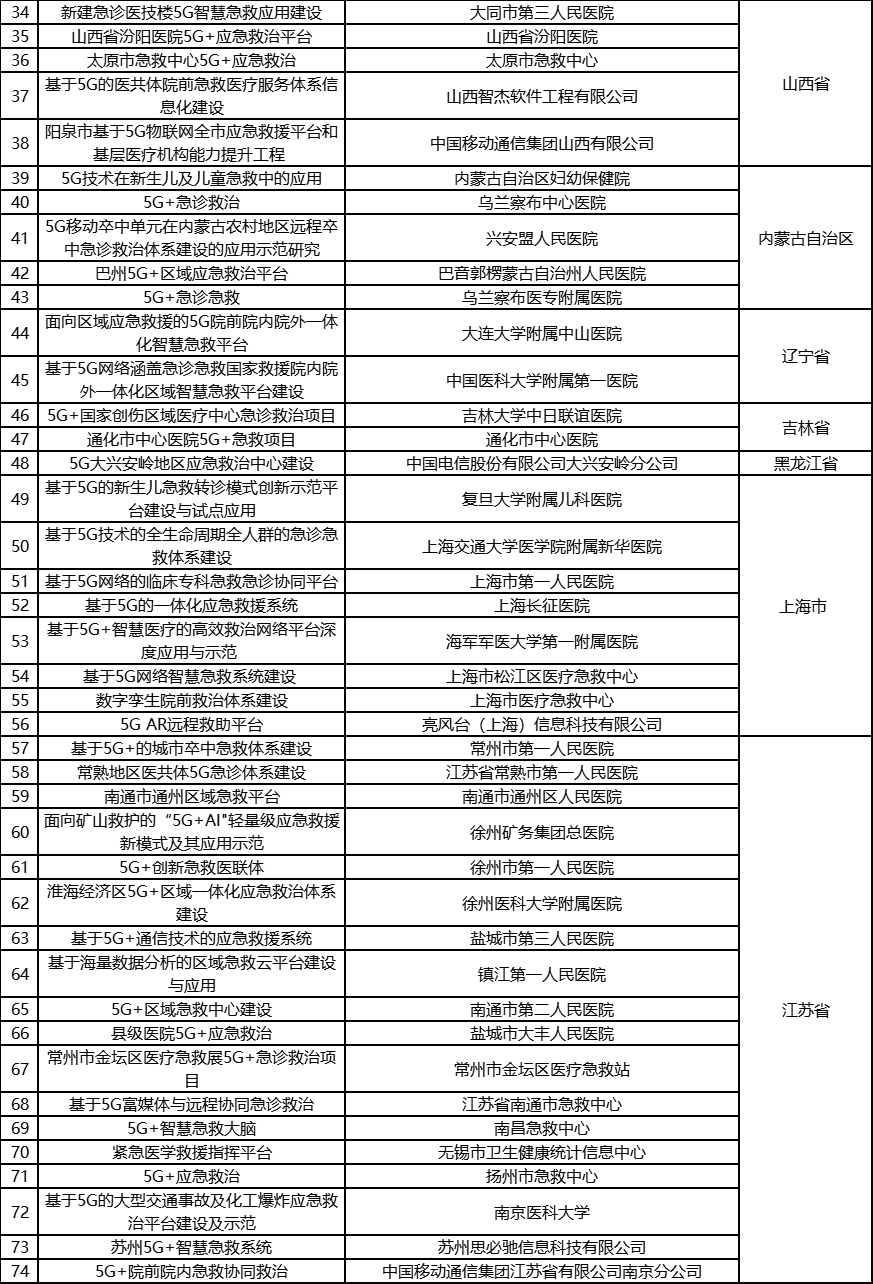根据《工业和信息化部办公厅国家卫生健康委员会办公厅关于组织开展5G+医疗健康应用试点项目申报工作的通知》(工信厅联通信函〔2020〕270号)有关要求,按照“宽进严出,优中选优”的整体工作思路,经项目申报、专家初审、复审等程序,现将5G+医疗健康应用试点项目名单予以公示。 如有异议,请以书面形式反馈。公示时间:2021年8月17日至8月23日。 联系单位: (一)工业和信息化部信息通信发展司 地址:北京市西城区西长安街13号 邮箱:wangcunxiang@miit.gov.cn 传真:010-66014360 (二)国家卫生健康委员会规划发展与信息化司 地址:北京市西城区西直门外南路1号 邮箱:xxtjc@nhc.gov.cn 传真:010-68791425 |