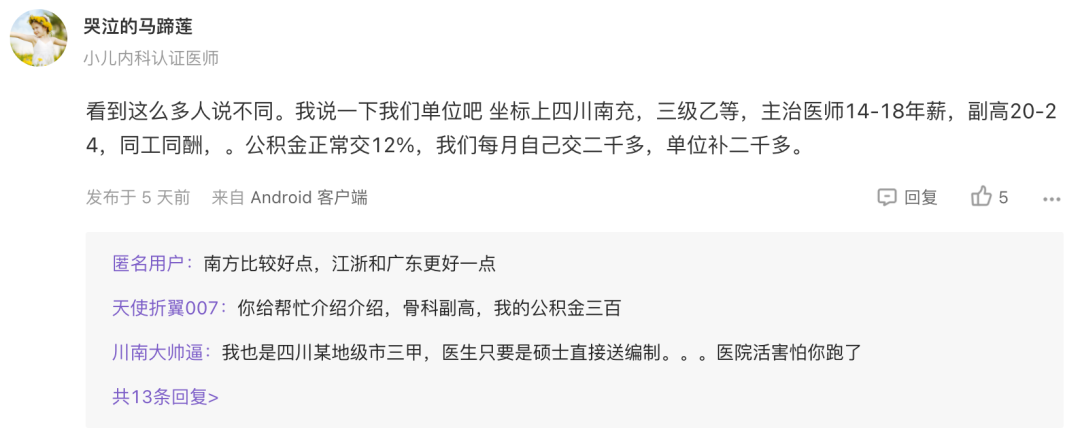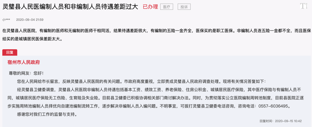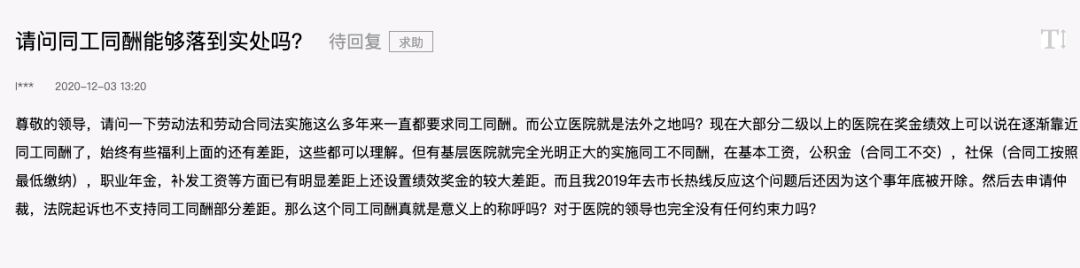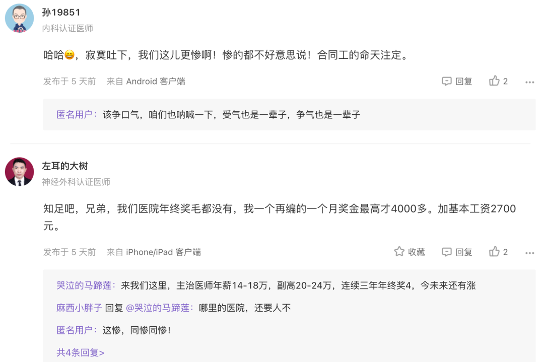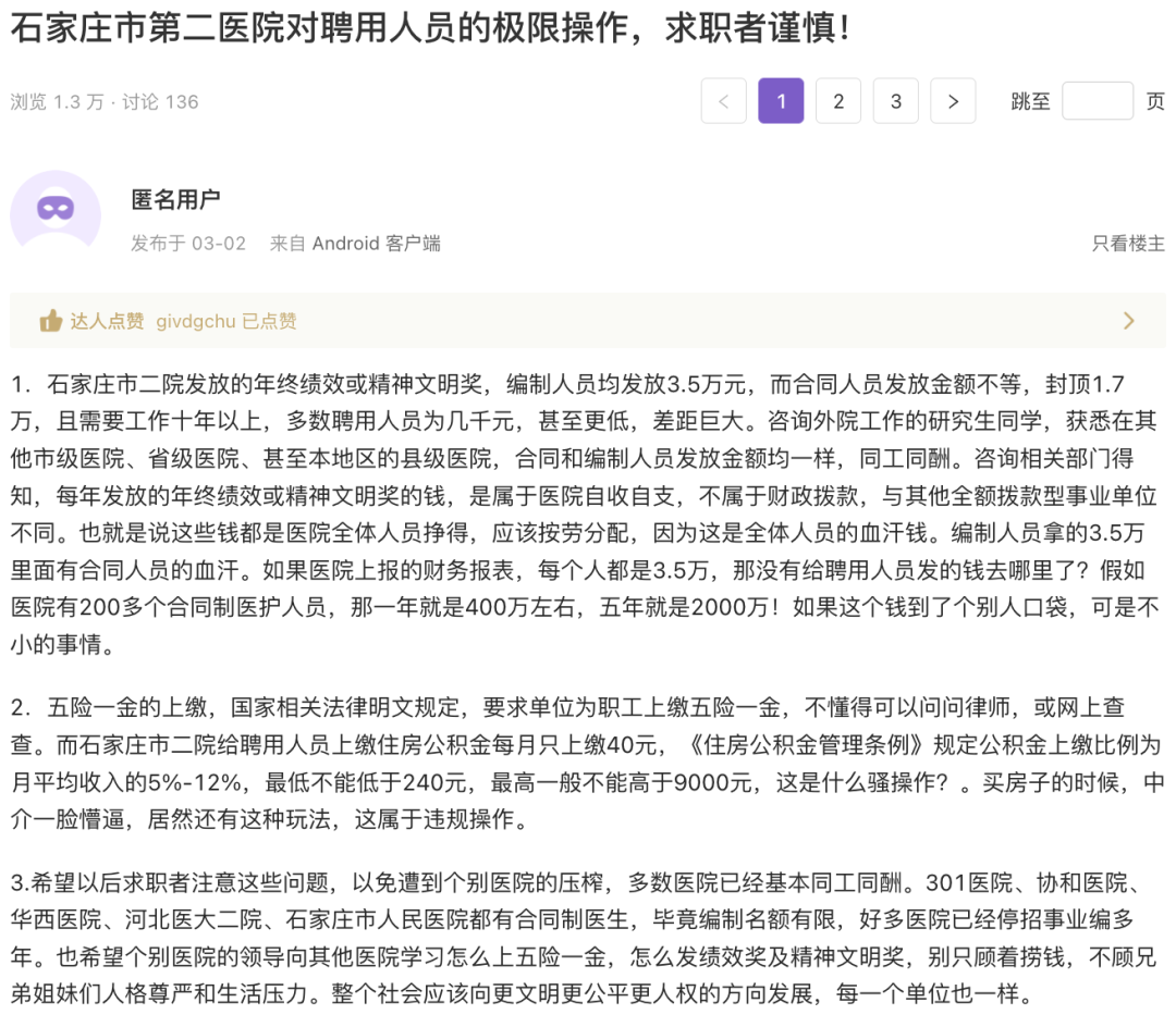 近日,有医生在丁香园论坛上爆料了自己所在医院的不公平待遇:在编人员和聘用制人员的年终奖励、五险一金等均存在显著差异。 同样为医院的建设用尽全力,待遇、保障等重要的生活议题却无法做到一碗水端平。 图源:丁香园论坛 可能出于保护隐私的考虑,该匿名爆料者并没有提供直接的图片、音视频等证据。 但较为详细的描述和相对具体的数字,也把同工不同酬的问题摆到了台前,每个月 40 元的公积金可谓让人大跌眼镜,这一话题也引发了论坛网友的热议。 根据网友的回复,相对于此案例而言,聘用制待遇极差、同工不同酬行径更恶劣的医院并非罕见。 图源:丁香园论坛 点击图片查看原帖 但也不乏有所在医院同工同酬政策落实到位的医生现身说法,给评论区带来一丝希望和向往。 图源:丁香园论坛 这一案例所反映的社会问题即便常见,但绝非等同于合情合理。 想要搞清楚这个问题,要对医务人员的「同工同酬」和「编制内外」有所了解。 「同工同酬」有法可依 根据 1995 年颁布施行的《中华人民共和国劳动法》,第 46 条写的清清楚楚:工资分配应当遵循按劳分配原则,实行同工同酬。 考虑到编制本身并不影响医生的执业范围和内容,此条法律显然适用。 但近三十年过去,依然有不少医院无法做到这一点,甚至在有人质疑的时候直接拿出「解聘」手段。 图源:丁香园论坛 部分医院采用分档次缴纳五险一金的方式来体现编制「内外有别」,让不少编外人员无奈走向市长信箱,收获的只是「面向未来」的解决意见。 图源:宿州市人民政府 由此看来,「编制」这个体现了国家组织机构的设置及其人员数量的定额和职务的分配的时代产物,在逐渐走向改革甚至部分取消的今天,法力可谓依然不减。 「编制改革」由来已久 医院编制的改革并非一时兴起,2011 年国家就出台了《中共中央国务院分类推进事业单位改革的指导意见》,文件指出:承担高等教育、非营利医疗等公益服务,可部分由市场配置资源的,划入公益二类。 图源:政府门户网站 2016 年第二季度人力资源和社会保障部的新闻发布会明确提及研究制定高校、公立医院不纳入编制管理后的人事管理衔接办法。 2018 年国务院发布了《关于开展建立健全现代医院管理制度试点的通知》,要求深化公立医院人事制度、职称评审和薪酬制度改革,并在全国范围内选定了 148 家试点医院。 图源:国务院新闻办 「有无编制」差异现状 医院的发展需要人才的不断更新,在编制数量极为有限的当下,「入编」大多被当作吸引高学历人才和优秀医生的激励手段。 大部分加入医院的新鲜血液,因此和有限的名额无缘,成为所谓的合同制聘用人员。 对于聘用制人员而言,档案的保管方式、用工形式、工资发放形式等多个层面都和在编人员存在差异。 但这些形式和程序上的差异,通常并不是医务人员最为关心的话题。 基本工资的数量、奖金的有无和分配比例、五险一金的缴纳标准、各类福利政策和待遇以及职务晋升的优先级等这些实打实的指标能不能一视同仁,才是潜在的不公平来源和广为诟病的话题。 2018 年提出的现代医院管理制度改革的内容之一,便是推行聘用制度、合同管理,实现同工同酬同待遇。 假如编制内外基本工资、绩效工资、年终奖、住房公积金、职业年金、各项福利待遇等完全相同,即便没有编制,想必大部分医生也同样可以心理平衡。 图源:国务院 但部分医院的管理层显然没有领会到文件精神,区别化对待也变相地在医院内制造了一批「二等公民」。 干着同样苦甚至更累的医务活动,领着更低的保障和更加微薄的薪水,还要定期担心工作是否稳定。 「不公现象」原因何在 部分医院对在编和聘用制医务人员区别对待的背后,可能存在着医院实力和整体收入等多种影响因素。 根据论坛网友的反馈。大型三甲医院两类员工的待遇区别可能要小于地市级二甲医院,而本案例曝光的医院即为一家二甲医院。 既往有调查显示,在用人成本上,使用一名编制外人员每年经费是在编人员的 1/3 左右。 在蛋糕很难做大的前提下,既得利益者们牺牲「人微言轻」的无编者的利益也不难理解。 此外,管理层的眼光是否长远,医生维权意识的强弱,也是此类问题发生背后的重要推手。 「同工同酬」实现之路 对医生而言,遇到此类情况,积极向医管部门反馈问题很有必要。 利用合理合法的途径制止医院的违规行为,也是对自己权益的捍卫。 实在沟通无果也可以考虑改换门庭,连基本的公平都做不到,未来或许还有无数个坑。 分享到医疗论坛也能帮助后来者提前规避风险。 图源:丁香园论坛 医院管理层也需要意识到:缺乏公平的待遇等,很难让员工有集体自豪感和工作积极性。 组织的良性发展需要全体员工的齐心协力,不患寡而患不均,制造「二等医生」的行为无异于断送医院的大好前程。 写在最后 在编也好,聘用也罢,医生和医院之间劳动关系的不同和身上的白衣与执业内容并无关联。 人为区分和区别对待,只会让医生对医疗大环境更加失望和寒心,最终导致患者、医生和医院三方面利益皆受损。 某些医院的领导们也该早日想明白这些道理,别等到人才流失、青黄不接时,再被迫开始高薪招人。 你在的医院今天同工同酬了吗?我们评论区见。 参考资料 https://www.dxy.cn/bbs/newweb/pc/post/46144212?page=1 http://www.gov.cn/banshi/2005