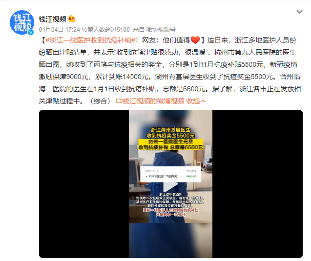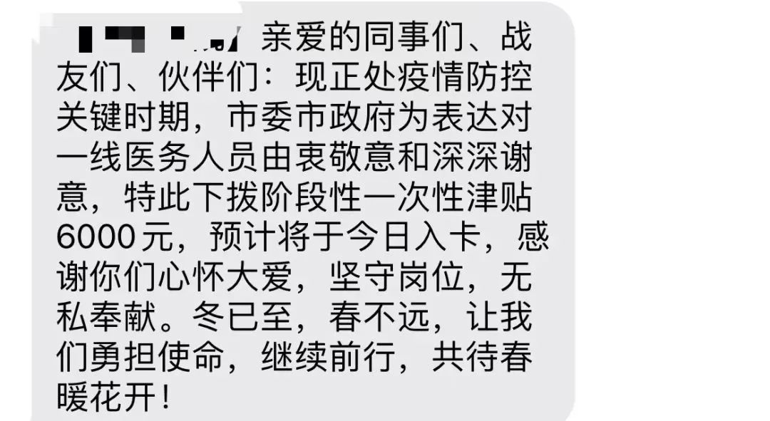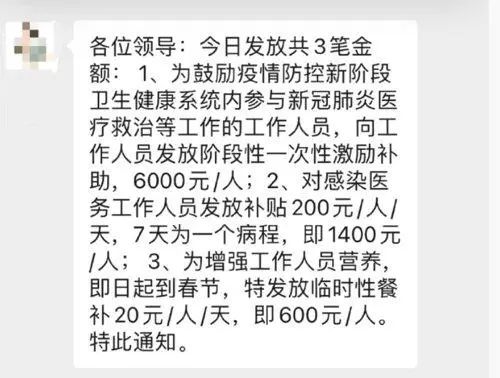 近期,浙江、上海纷纷出手了!浙江一线医护收到抗疫补助14500元!上海一线医护收到抗疫补助6000元! 当前,疫情防控进入了新阶段,所有人都在一起努力和病毒作战。但其中最辛苦的、承受了巨大压力的,当属我们的医护人员! 他们,一方面因感染大幅减员,另一方面又要面临急剧增加的危重患者。哪有什么“天选打工人”,只不过是一群普通的白衣战士与同事,咬碎牙在坚守! 面对这种情况,多地出台了关爱医务人员举措。 很多小伙伴想知道举措实施后续,这不就来了! 据南都报道称,上海市卫健委近日发布《关于保障抗疫一线医务人员力量的工作意见》的通知,提出疫情防控面临新形势新任务,广大医务人员承担非常繁重工作任务,要进一步保障抗疫一线医务人员力量。 通知要求,在落实绩效激励方面,按要求向市、区两级医疗机构中直接参与新冠病毒感染防疫和救治一线工作的医务人员发放相关补助。 发放对象包括市、区公立医院和急救中心(含急救车的驾驶员、担架员)、社区卫生服务中心等。目前已有多家上海医疗机构发放了一次性激励奖。上海一线医务人员预计将于2022年底陆续收到6000元的一次性津贴。 近期,网上陆续有人分享收到补助截图,据说不分正式工在不在编制内,抗疫一线就有。 杭州市第九人民医院的医生晒出收到的津贴,数目不菲,共计14500元。其中包含去年1到11月份的抗疫补贴5500元及新冠疫情激励保障9000元。 湖州有基层医生收到了抗疫奖金5500元。 台州临海一医院的医生在1月1日收到抗疫补贴,总额是6600元。 对于以上情况 小编只想说:你们值得! 希望其他地区也能够出台相关政策! 希望公布政策的地区,能尽快落实到位! 领导不缺钱,才不会管医务人员的补助呢,只会开会。 本文编辑:Peng |
