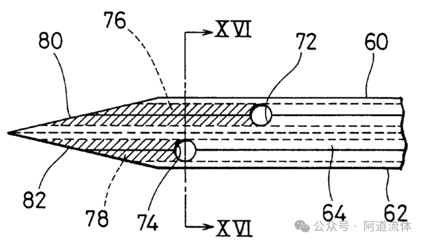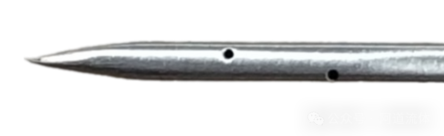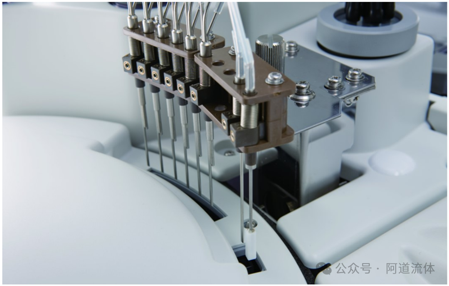 上一篇“IVD仪器液路 集成式空气移液泵和Tip头”介绍了集成式空气移液泵+Tip头方式的吸液、移液方案,另外一类比较常见的吸液、移液方案,是使用采样针/试剂针。 采样针/试剂针,其实就是加工成特定尺寸的金属管。因为不锈钢材质价格便宜且性能优异,所以针以不锈钢材质的居多。 有些公司宣称使用MP35N(镍-钴-铬-钼合金)材质的采样针,这种材质在生物相容性上表现更好,部分机械性能也比不锈钢更优异,但相应的加工难度、价格等也更高。 当然还有一些仪器中,直接使用塑料硬管(“IVD仪器液路常用管子介绍”)做“针”。如Siemens公司的Advia 2120i血细胞分析仪的开口采样模式,直接使用Teflon管做“针”。 Cytek 的North Light全光谱流式细胞仪使用Peek材质的硬管,作为进样针。 也有专门做Peek“针”的厂家。 不同于Tip头的一次性使用,采样针/试剂针是重复使用。为了降低携带污染(“IVD仪器携带污染简单介绍”),采样针内外表面光洁度要求都非常高,比如内表面进行镜面处理。 图片来源:深圳市大川流体控制技术有限公司 降低携带污染的另外一种方式,就是针表面增加特殊涂层。 对于开口或闭口的样本/试剂管,针分为穿刺针和非穿刺针。穿刺针可以刺破比如采血管的橡胶塞管帽,在不打开样本管管帽的情况下,吸到样本或试剂。 穿刺针在血细胞分析仪、糖化血红蛋白分析仪等测试全血的仪器中,比较常见。穿刺针的针头往往是非常尖锐的,以便进行穿刺。针头的吸液小孔,有的设计在针的正下方,有的设计在针的侧壁上。吸液小孔在侧壁上,相应的可以降低一些针孔堵塞的概率。 而带管帽的闭口的样本管,内部往往还有一些残留负压(真空采血管内的负压,是用来将患者的血吸入管内),吸样前需要进行压力平衡。当然,吸样过程中也需要气压平衡。 实现样本管内气压平衡,主要有两种方案。一种方案是针采用双孔针,一个孔和大气或气源导通,用于平衡气压,另外一个孔用于吸取液体。如Sysmex的XE系列血细胞分析仪的穿刺针,是两根钢管焊接在一起,有两个孔。 另外一种方案,是在针的外表面上开槽。当针穿入管帽橡胶塞时,针表面的槽,平衡掉试管内部的压力。如下面Tecan的穿刺针外壁开槽的专利(下图是从针尖方向顺着针看的视角,4为针外壁通气槽)。 还有一种形式的穿刺针,是穿刺用的针内径更大,将吸样用的针套在穿刺针内部。穿刺用的针先穿破瓶盖胶塞,然后吸样用的针从穿刺针的内孔进入样本管,进行吸样。 也有穿刺和吸样是完全独立的两根针的设计。穿刺针是实心的,针尖刃口比较锋利,先在胶塞瓶盖上刺戳一次,它可以对瓶盖胶塞造成比较大的创口。然后穿刺针拔出。再用吸样针从前面造成的创口进入采样管。 穿刺针需要不停地穿刺橡胶塞样本管盖,时间久了之后,随着穿刺次数的增加,针可能出现磨损、钝化、针孔变形等。这种情况就需要及时进行更换,以免影响测试结果。其实这些情况下,针就变成了耗材。仪器内部往往会记录针的穿刺次数或使用时间,以及时提醒用户进行更换。 针往往需要通过管路和加样用的精密泵连接在仪器,所以很多针都设计了连接管路的接头,便于拆装、更换。当然,有些对携带污染要求较高的场景,样本、试剂等液体,尽量都停留在针内部,