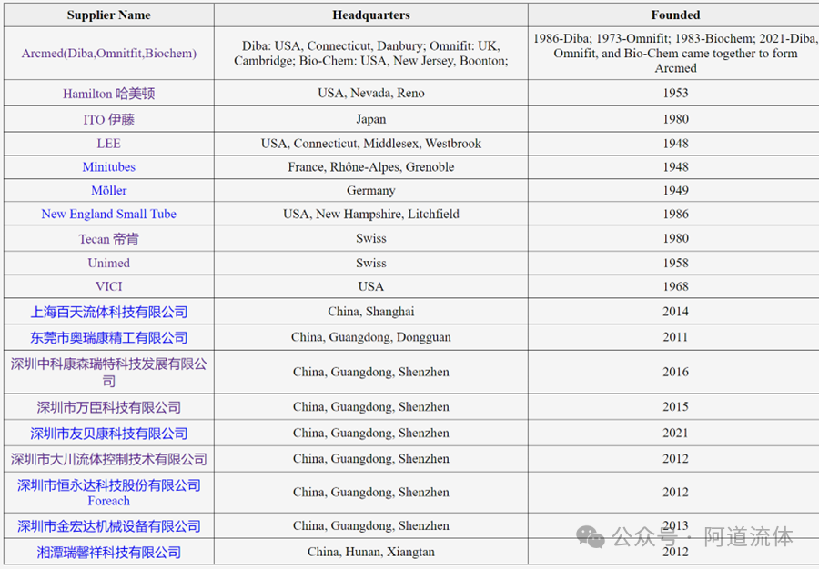 而不要经过接头。针的长度、孔径等参数的值在设定时,就要考虑让针的内容积要足够,保证试剂或样本不要到达接头区域。 针用来吸取样本或试剂,那么针尖的性状,可能会影响样本或试剂的死体积量(最小量);针尖的形状,也可能影响分配样本或试剂时的加样精度。 有些针为了满足液路系统的需求,还集成了加热、电容式液面探测等功能。 除了用于吸样本、吸试剂的针,还有冲洗针、洗涤针等,这类针的要求相对会低一些。 样本针/试剂针的一些主要生产厂家如下: |