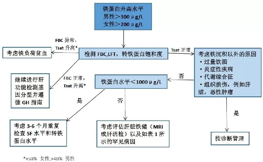 铁在体内主要以血清铁蛋白的形式存在。血清铁蛋白是人体含铁最丰富的一种蛋白复合物,是铁的主要贮存形式之一。因此血清铁蛋白是检查体内铁缺乏的最灵敏的指标。它存在于肝、脾、骨髓等网状内皮系统内,为骨髓合成血红蛋白供铁,并按机体的需要向血清中释放。 肝脏含铁蛋白约占体内贮存铁的1/3,而血循环中的铁蛋白又被肝细胞清除,肝病时血清铁蛋白可升高。而铁蛋白还是一个急性相的反应物,在感染、炎症及其它各种应激下均会升高,从而在一些炎症性疾病、心脑血管疾病和各种外伤性疾病中铁蛋白均会增高,但一般仅轻度和中度升高。 另外恶性肿瘤细胞合成铁蛋白量常异常增加(浓度多大于1000ng/mL),因此铁蛋白也是恶性肿瘤的标志物之一。 1、血清铁蛋白降低见于 (1)缺铁性贫血,具有早期诊断价值。 (2)失血、营养不良、严重慢性疾病(如长期腹泻)体内贮存铁减少导致的继发性贫血。 2、血清铁蛋白增高可见于多个系统疾病中 (1)体内铁贮存过多:如长期接受输血和不恰当的铁剂治疗; (2)恶性肿瘤:如肝癌、肺癌、结肠癌、胰腺癌、乳腺癌、白血病等; (3)急性感染和炎症; (4)消化系统:多见于肝脏疾病如急慢性肝炎、肝硬化、肝坏死、脂肪肝等; (5)心脑血管病:急性心肌梗死、动脉粥样硬化、原发性高血压、脑梗死、脑出血等; (6)呼吸系统:肺结核、肺炎等; (7)内分泌代谢性疾病:2型糖尿病、成人still's病、代谢综合征等; (8)肾脏疾病:慢性肾病、尿路感染等; (9)其他疾病:如各种外伤性和骨折性疾病等。 图1 SF水平升高临床调查流程 (FBC:全血计数 GH:遗传性血色病 LFT:肝功能检测 SF:血清铁蛋白 Tsat:转铁蛋白饱和度) 许多慢性炎症和肝脏疾病可使SF升高,检测转铁蛋白饱和度(Tsat)可以确定铁储备是否增加,是调查SF升高的关键。 患者的临床病史和相关检查,再结合一些简单的调查,往往会揭示铁蛋白升高的根本原因。特别是在问诊时,应该注意患者关于酒精摄入和其他肝病的危险因素,输血史,口服补铁史,铁过载家族史以及糖尿病、肥胖、高血压、早期白内障等病史,以及可能指向潜在炎症或恶性疾病的症状和体征。 初始检查应该包括全血计数,重复SF水平检测,肾功能,肝功能以及炎性标志物,如C反应蛋白、红细胞沉降率和血浆黏度。 对于其他情况良好伴有不明原因SF升高和Tast升高<40% (女性) 或 <50%(男性)的患者,可先行观察一段时间:如果SF和Tast升高水平稳定、适度,则不需要进行进一步调查;如果SF和Tast水平波动变化则通常见于肝脂肪变性和过度饮酒;持续性不明原因的高铁蛋白血症,尤其SF>1000μg/L时,可考虑转诊至肝病专科治疗。 在大多数继发于炎症或其他原因的高铁蛋白血症患者中,治疗基础病因可使SF水平降低,例如戒酒通常会在几周或几个月内改善SF水平。通过减重以及改善控制血糖和血压通常会降低代谢综合征患者SF水平。 个体患者正常SF水平应考虑年龄,性别以及种族因素(Grade 2A)。 导致SF水平升高的反应性原因包括恶性肿瘤,炎症性疾病,肾衰竭,肝脏疾病以及代谢综合征,与真正的铁过载相比,这些原因更加常见(Grade 1B)。 SF水平显著升高(>10 000μg/l)时,应及时考虑罕见的原因,例如成人斯蒂尔病或嗜血细胞性淋巴组织细胞增多症,也可能为肾脏或肝脏疾病,感染以及恶性肿瘤(Grade 2B).。 SF升高患者的问诊应该包括饮酒和其他肝病危险因素,移植治疗史,家族铁过载病史以及是否存在2型糖尿病,肥胖和高血压,也包括可能预示潜在炎症或恶性疾病的症状和体征(Grade 1C)。 针对SF水平升高的患者,一线检查应该包括全血计数和涂片,重复SF检查,转铁蛋白饱和度,炎性标志物(C-反应蛋白,红细胞沉降率或血浆黏度)以检测隐蔽的炎症性疾病,血肌酐和电解质可评价肾功能,肝功能检查,肝炎病毒筛查和腹部超声检查(如果肝功能异常),并检测血糖和血脂水平(Grade 1C)。 对于其他情况良好的不明原因的中度SF水平升高 (<1000μg/l)以及转铁蛋白饱和度正常的患者,可观察一段时间,如果生活方式调整适度,可在3-6月后重新进行评估(Grade 2C)。 对于不明原因的持续性高铁蛋白血症(SF>1000μg/l)的患者需转诊至肝病科进行诊治(Grade 2C)。 对于非酒精性脂肪性肝病患者,没有证据支持放血疗法可降低SF水平(Grade 1B)。 总之,铁蛋白是一种非特异性标志物,在实验室检查或体检中不要看到铁蛋白高了就以为患肿瘤了,需结合临床具体分析。如异常增高,请及时就诊。 |