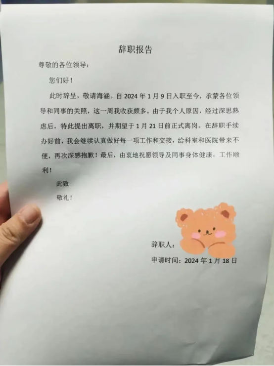 这名医生表示,一个没有医师资格证的人分到的都是自己的两倍,那自己还不如什么都不参与,直接当个实习生算了。 他更是直言,自己只想要一个基本绩效,若是连这个最低的要求都无法满足,那就申请调换到其它科室。 该医生的吐槽刺痛了很多同行的眼睛。 相信大家都深有体验,在平日的工作中,自己身边的医生有道德有医德,一心一意为病人着想,但真当自己遇到不公平时,总是一步步退让,期盼自己的退让能给自己带来一些安稳,为了这份安稳,即便是丢掉自己曾经最珍贵的东西也在所不惜。 时间长了,大家都麻木了,只要刀没架到自己脖子上,都可以当什么都没发生过,这样的现状让人无可奈何。 与医生的吐槽一起引发关注的,还有另外一名“00后”医生的频繁辞职。 据了解,这名年轻的医生从毕业后到现在第三次从医院辞职离开了。她的辞职离开,给很多同行带来了很大的震撼,让众人无比惊讶。 从医生发的帖子中得知,她来这家医院仅有一周,很喜欢科室的氛围,科室的前辈们知道她要离职后,都轮番上阵挽留她,但她还决定离开,因为无法忍受医院这种高强度的工作时间。