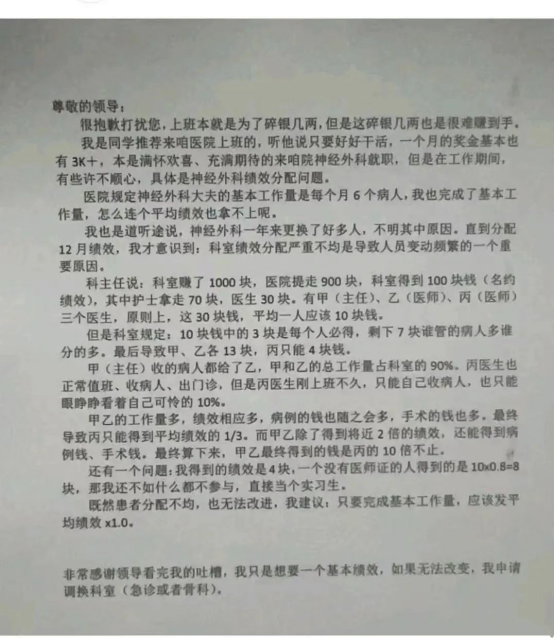 最近一医生发帖吐槽医院绩效分配有问题,引起小范围轰动。 有同行直言:很佩服这个医生的勇气,至少他敢把自己内心的想法和委屈说出来。 小检君看了医生发的帖子,总结了一下大概内容,如下: 一. 临床和行政之间分配不均。 医院要分走科室赚的90%,仅留下10%让科室自己分配,这也就意味着,绩效收入这一块蛋糕的分配,行政和临床的占比9:1。 这些年,临床医生在一线累死累活,而分绩效时行政要分一杯羹,导致临床医生的付出和收入不成正比,就一直饱受诟病。虽然大家会相互抱怨,也无数次在网络各大平台呼吁社会各界能够看到医生当前生存的现状,但很少会有人这么硬杠医院领导,这也是为什么这个医生的吐槽会引发关注的最根本原因。 二. 医护之间分配不均 医院拿走90%的绩效收入,仅剩10%给到科室,而这10%还得拿出70%给护士,到医生手的就仅剩了30%。可想而知,医生这到手的绩效是有多低。 仅剩余10%的绩效,护士拿走了70%,医生收入就更少了,而在这更少的分配中,医生与医生之间的分配也有很大的差距。 按理来说剩下的钱,3名医生应该平分,但据科室规定,这30%中,还得拿10%出来,每个医生必须得其中的30%,剩余绩效,3名医生谁收的病人多,就分给谁。 这也就意味着,有医生能拿到的绩效非常低,甚至还不如实习生。