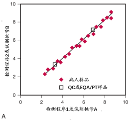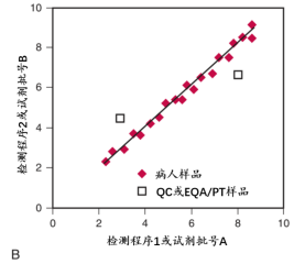 形成一个质量控制计划和实施质量控制程序 一、选择质量控制物质 一般,必须有两个不同的浓度进行合适的统计QC。对定量检测程序,QC物质应选择提供的检测浓度,监视检测程序的分析检测区间。在实践中,实验室经常被市售QC产品可用的浓度所限。只要有可能,很重要的要确认,检测程序性能在接近它的分析检测区间的限值处是稳定的,因为失败首先影响了这些浓度。许多定量检测程序在整个分析检测区间具有线性响应,如果接近区间限值的结果是可接受的话,很合理地假设在整个区间内它们的性能是可接受的。在非线性分析响应的情况下,有必要使用在中间浓度处的另外控制品。在临床决定处的关键浓度(如,葡萄糖、治疗药物、TSH、前列腺特异抗原、HbA1c、肌钙蛋白)也会要相应的QC监视。在许多情况下,接近量值限值的不精密度会相对较大,在该浓度处应选择提供合适的SD在实用上评价QC结果。对于具有提取或其他前处理步骤的程序,控制品必须被用在包括任何前处理的步骤内。 本章主要关注定量检测程序的QC程序。但是,原则可以被没有数字结果大多的定性程序采纳。依据定性解释定量检测的检测程序(如,毒品药物、HCG、肝炎标志物),被应用在数字结果的QC评估的相同原则,即使它们仅仅表达了为仪器信号值。对于定性结果,应选择阴性的和阳性的控制品,具有的浓度相对地接近判断限以核实地控制阴性和样品间的区分。对于区分阳性强弱的分级响应的定性程序(即,尿液试纸条),要求阴性的、阳性的、和分级响应的控制品。对于依据其他性质的定性检测项目(即,电泳程序、染色的适当、免疫荧光、微生物确认),必须确保QC程序将相应地评价检测程序,可正确地从病理情况下区分出正常。 选择的QC物质必须被制备成提供一个稳定产品,可以被用于较长的时间周期,最好对稳定的被测量可有效1年或更长。使用一个批号的、有较长有效期的QC物质,可以可靠地解释被建立的指标,将允许有效地证实检测问题,避免因很差确定的QC结果预期范围引出假性警告,和消除在实际和校准品批号更换后解释值的局限性。 图6.5 可互换和不可互换样品的表现。(A)QC或EQA/PT样品(白色方块)在两个检测程序间或两个试剂批号具有与病人样品(红色方块)相同的关系,是可互换的。(B) QC或EQA/PT样品与病人样品观察到具有不同关系,是不可互换的。 二、质量控制物质的局限性 在大多可用的QC物质中局限性是固有的。一个局限性是QC物质经常与临床病人样品不可互换。互换性是一个参考或控制物质的性质,指的是在检测程序中,该物质模拟了病人样品。可互换的QC物质在某个检测程序中的反应,给出的结果,与具有相同量的被测量的真实预期病人样品预期极其一致。图6.5A说明,病人样品的和可互换的QC(或EQA/PT)样品的结果,在两个检测程序间或用于相同检测程序的两个不同批号试剂间,具有相同的关系。图6.5B说明了不可互换的样品具有较在病人样品中被观察到的,具有不同关系。 QC以及EQA/PT物质与临床病人样品是经典地不可互换的,因为血清或其他生物体液的基质通常被来自某个病人样品的改变。基质的改变因在产品制备中对生物液体的处理;使用了部分被纯化的人的或非人的添加物,使达到合适的被测量浓度;和各种稳定化的过程,改变了蛋白、细胞、和其他成分。基质改变的影响对被测量的回收是无法预测的,对不同批号的QC物质、对某个给定检测程序的不同批号试剂、和对不同检测程序,经常是有差异的。因为不可互换性的局限性,要求特定的程序(在后面讨论)在改变试剂批号或在两个或更多的检测程序间比较QC结果。 QC物质的第二个局限性是在储存中被测量的失效。在未开瓶储存的被测量稳定性一般非常好,但是缓慢地失效实际上限制了产品的有效期,可引入对QC数据逐渐漂移,会要求在某批号QC物质整个有效期内予以纠正。在复溶、冻融、或开瓶的被测量稳定性,可以是QC结果变异的重要来源,在相同瓶内的不同被测量间非常不同。控制的变量在室温与时间有关,未开瓶的随时间有蒸发的潜在性。在开瓶后的失效期由QC厂商提供,但是,会需要由实验室为每个QC物质在使用条件下去建立,相同的QC产品不同的被测量会是不同的。添加稀释液复溶的QC物质,在可能下使用标准化的加样程序可以消除瓶间变异(如,使用相同的吸管或加样设施,最好是自动的设施,由同一个人实施操作) 另一个局限性是,在多成分的控制物质中各个被测量浓度会不在所有检测程序的最适水平。这个局限性可因溶解度考虑,或在不同成分间的潜在互相反应,特别在较高浓度处。有必要使用其他的QC物质,去合适地监视检测区间和临床上重要的决定浓度 三、检测质量控制样品的频率 确定检测QC样品的频率应使用风险评估方法。检测QC样品的频率是多个参数的函数: