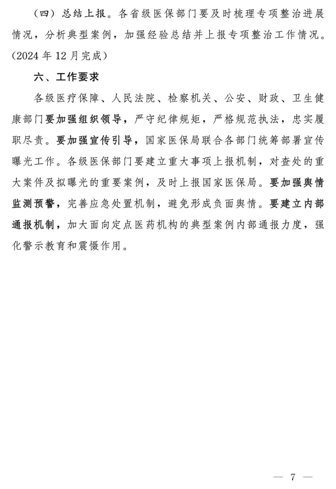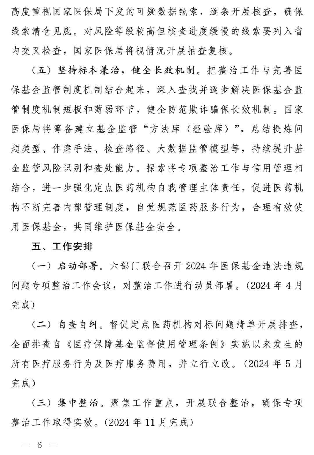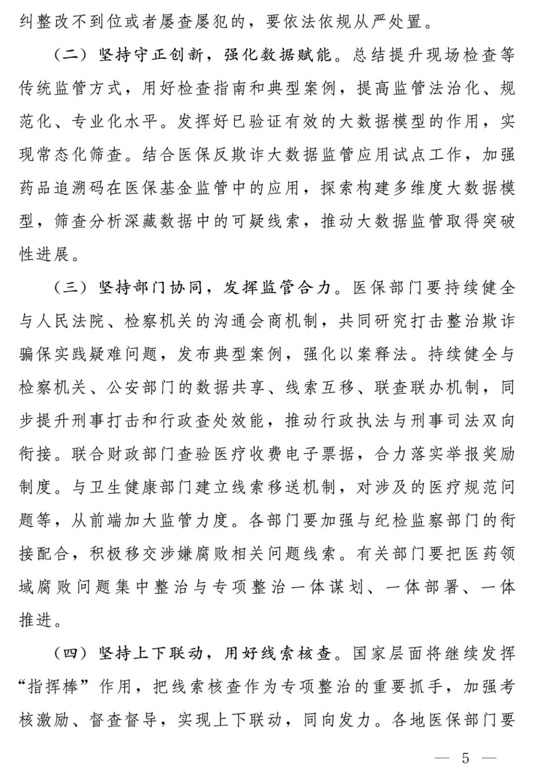 在国家层面发文之前,地方上已有动作。 4月8日,甘肃医疗保局在甘肃省人民医院召开2024年甘肃省基金监管飞行检查兰州启动会,标志着2024年甘肃省基金监管飞行检查正式启动。 河北医保局印发《医保基金监管效能提升年活动工作方案》,明确2024年飞行检查聚焦重症医学、麻醉、肺部肿瘤等重点领域,同时开展挤占挪用医保基金问题专项检查,实现省对市、市对县全覆盖。 伴随各地陆续启动2024飞检,新一轮医院大检查已拉开序幕。 部门联动方面,从最初联合国家卫生健康委、公安部开展打击欺诈骗保专项行动“回头看”,到2023年邀请最高人民检察院、财政部加入专项整治,2024年又邀请最高人民法院加入,行政执法与刑事司法进一步有效衔接。根据近期“两高一部”发布的《关于办理医保骗保刑事案件若干问题的指导意见》,定点医药机构(医疗机构、药品经营单位)以非法占有为目的,实施下列行为之一,骗取医疗保障基金支出的,对组织、策划、实施人员,依照刑法第二百六十六条的规定,以诈骗罪定罪处罚;同时构成其他犯罪的,依照处罚较重的规定定罪处罚:伴随惩戒标准明显,针对欺诈骗保的震慑力再度增强。本次专项行动还将联合财政部门查验医疗收费电子票据,合力落实举报奖励制度 ,同时要求各部门加强与纪检监察部门的衔接配合, 积极移交涉嫌腐败相关问题线索。 共同构筑综合监管、联合整治的监管生态。 《通知》提到,要发挥好已验证有效的大数据模型的作用,实现常态化筛查。结合医保反欺诈大数据监管应用试点工作,加强药品追溯码在医保基金监管中的应用,探索构建多维度大数据模型,筛查分析深藏数据中的可疑线索,推动大数据监管取得突破性进展。在近期召开的2024年全国医保基金违法违规问题专项整治工作会议上,“强化数据赋能,构建“事前提醒、事中审核、事后监管”三道大数据监管防线” 也被列为重点之一。根据官方披露,从人工抽单式现场审查到智能审核、智能监控、大数据监管等现代信息技术手段的综合应用,监管精准性、实效性实现整体跃升。2023年通过事中审核实现拒付23.24亿元。2023年仅通过对“虚假住院”大数据模型筛查出的可疑线索开展核查,就查实并追回医保资金3亿余元 。国家医保局介绍,2023年持续推进全覆盖监督检查,处理违法违规人员32690人,协同公安部门共侦破各类诈骗医保基金犯罪案件2179起,抓获犯罪嫌疑人6220名,追缴涉案医保基金11.4亿元。近年来,欺诈骗保逐步呈现链条化、系统化及专业化等倾向。基于多部门联合整治,以及智能化手段加持,医保监管的震慑力和精准性全面提升,医疗市场将走向规范化发展。附全文: