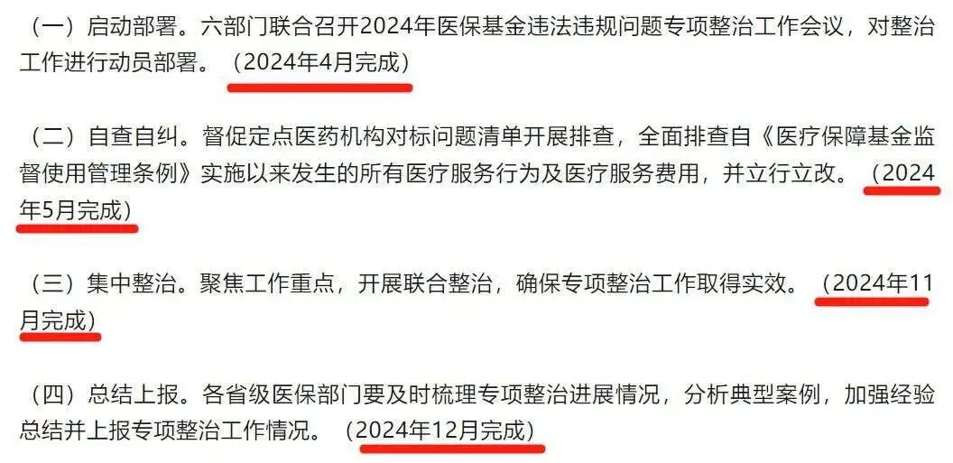 聚焦纠治一体,对骨科、血透、心内、检查、检验、康复理疗等重点领域,全面开展自查自纠,持续推进问题整改。国家医保局将制定下发骨科、血透、心内、检查、检验、康复理疗等重点领域问题清单,督促引导定点医药机构对照开展自查自纠。 《通知》指出,国家飞行检查、省级飞行检查、市级交叉检查都要将上述六个领域作为检查重点。 自查自纠整改落实情况将与日常监管工作“真挂钩”,自查自纠认真整改到位的,可以视情况考虑将来减少现场检查频次。整改不认真不到位的不仅要从严从重处理,还要作为监管重点对象。 工作安排如下: