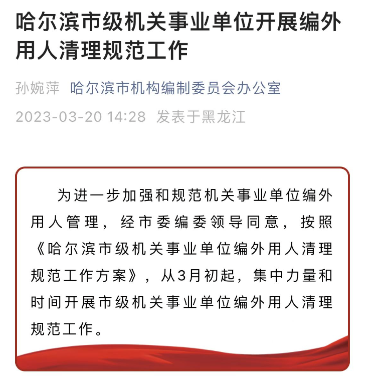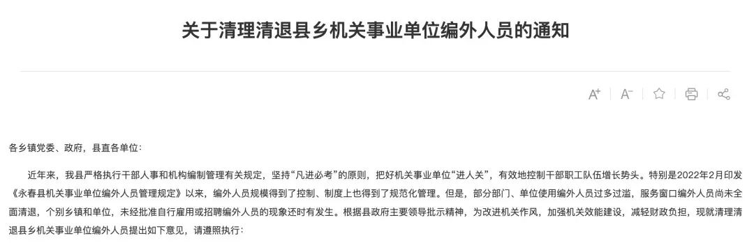 最近,「清退编外人员」的话题再次引发热议。近日,泉州市永春县人力资源和社会保障局发布了《关于清理清退县乡机关事业单位编外人员的通知》,其中提到「卫生系统要在前阶段清理清退的基础上,根据单位工作量大小、人员、岗位分布配置以及核定的职数,继续做好清理清退工作」。