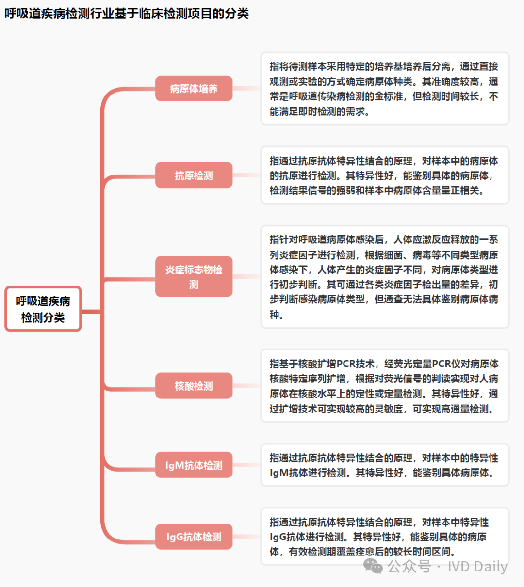 常见的呼吸道病原体主要包括流感病毒、腺病毒、呼吸道合胞病毒、肺炎支原体、人偏肺病毒、人副流感病毒等。按照临床检测项目的分类方式,呼吸道疾病检测行业可以分为如下类别: