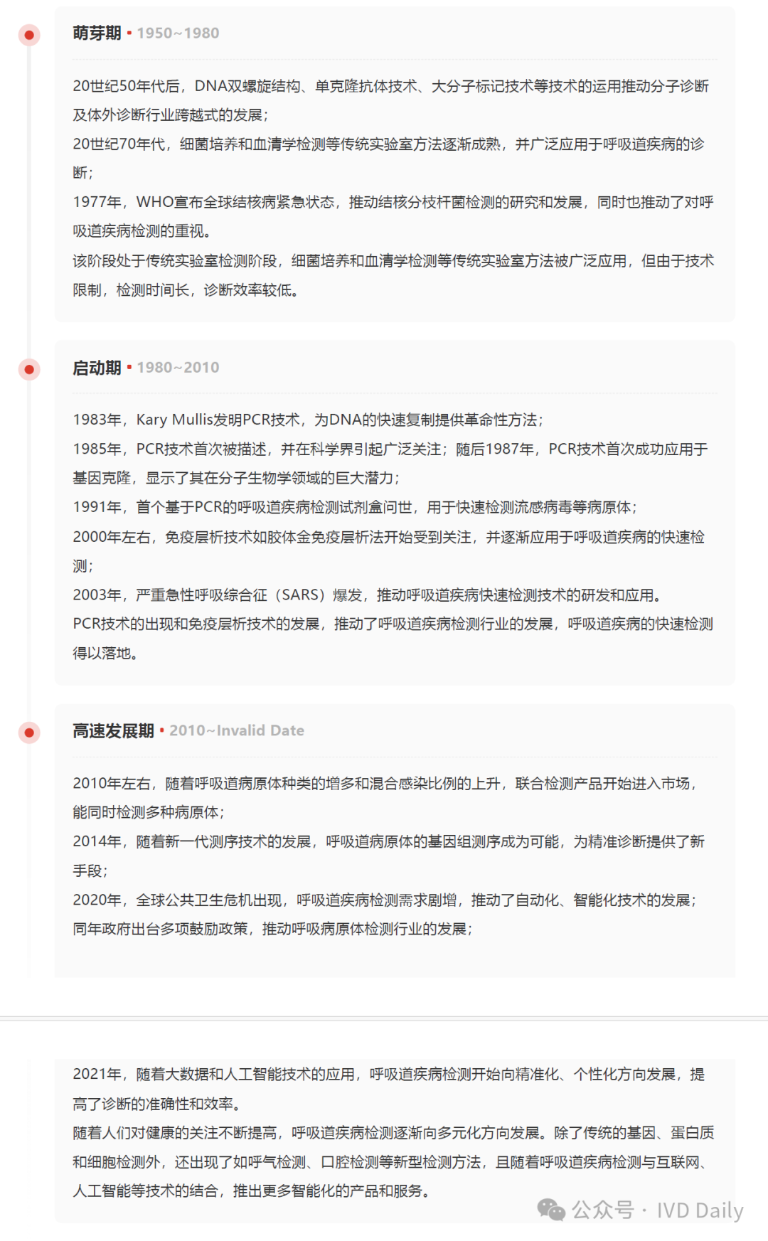自20世纪50年代后,DNA双螺旋结构、单克隆抗体技术、大分子标记技术等技术的运用推动分子诊断及体外诊断行业跨越式的发展,至今已经历70余年的发展。20世纪80年代中期,PCR技术的出现,为DNA的快速复制提供了可能,随后免疫层析技术的出现,进一步推动呼吸道疾病的快速检测发展。2010年后,联合检测产品开始进入市场,且伴随着新一代测序技术的发展及人工智能的应用,呼吸道疾病检测开始向精准化、个性化方向发展,提高了诊断的准确性和效率。