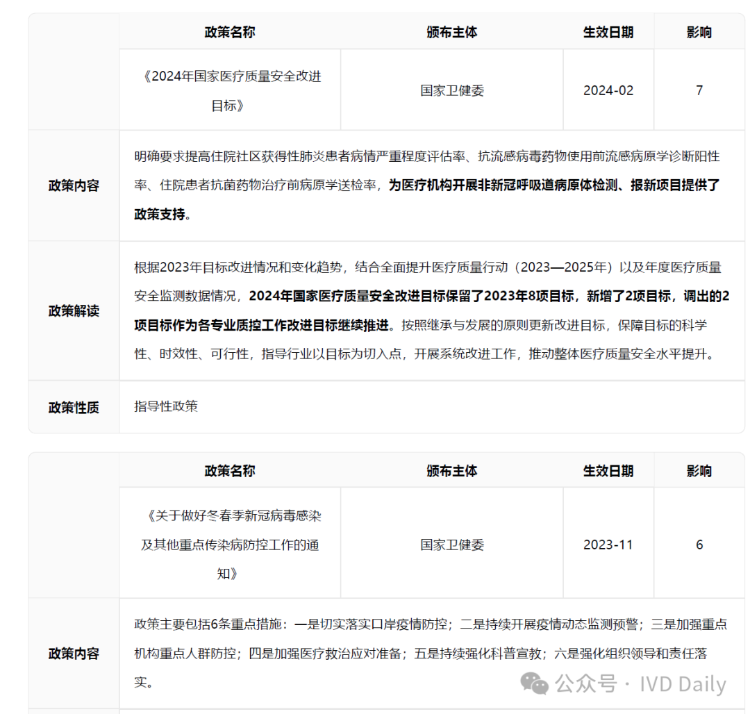 政策端为医疗机构开展呼吸道疾病检测、报新项目提供支持。2024年2月,国家卫健委发布《关于印发2024年国家医疗质量安全改进目标的通知》,明确要求提高住院社区获得性肺炎患者病情严重程度评估率、抗流感病毒药物使用前流感病原学诊断阳性率、住院患者抗菌药物治疗前病原学送检率,为医疗机构开展非新冠呼吸道病原体检测、报新项目提供了政策支持,将推动呼吸道病原体检测覆盖率。