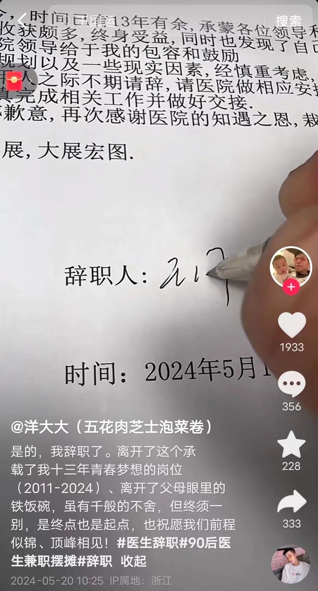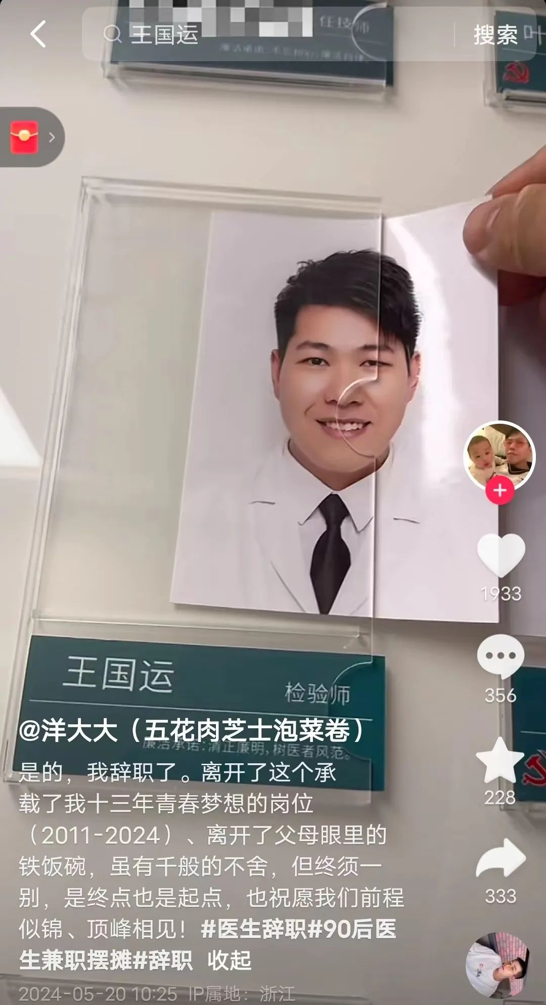 下班后在抖音分享摆摊日常,经历过爆红又再次翻红,34岁的检验科医生王国运,还是从自己工作了13年的医院辞职了。 其实,早在去年这位检验科医生的首次爆红时,检验君就曾专门报道过他,也曾引起业内大家的广泛热议。 这是一位在社区医疗机构检验科工作的90后检验人,月收入在8000元~10000元左右,说实话这个收入放到全国检验行业的一线工作者中并不算低了,尤其还是基层医院检验科。 工作强度也不高,每天4点半下班,在父母的帮助下每天下班摆摊,夏天卖芋泥冰,冬天卖五花肉芝士泡菜卷、手工三明治。 他无疑是努力的。在主业之余每天下班后就回家进行准备工作;到 17~18 点出摊,22:30收摊回家休息。 他更是幸运的,经历过两次爆火,各种媒体报道后,王国运老师的小吃摊生意已经走上正轨,日收入稳定在1000~2000元。从23年8月开始至今,短短数月,他的副业收入已经远超正职收入。 今年5月他再度翻红后,丁香园也曾报道过他。在王国运老师从医院辞职后又专访过他。 成功是多个因素的共力 切勿轻易模仿 “网红经济”时代,流量可以是破天的富贵,也能是入口的毒药。 流量造“神”奇迹来得快去的更快,前两年爆火的流量网红如今可能再难刷到了。 流量为王国运老师的兼职带来了实实在在的收入,但也给他造成了不小的困扰。流量最高峰的时候,王国运老师即使上班也会有接不完的电话,微信有加不完的好友,还有想去医院采访的媒体,摆摊甚至都要因此中断。 在自己两次爆火后,他都在不断强调不要盲目地模仿他。 他的成功除了身份的反差、流量的青睐之外,还离不开父母家人的支持和帮助。 在摆摊和自媒体的兼职带来的收益尚不稳定的时候,他从来都是将医生作为主业。尽可能不让主业受到兼职的影响。 辞职全身性投入创业也是在副业收入稳定之后才做的选择。 他和很多检验人的想法一样,觉得检验科的工作比较单一,好像一眼能看到老。 体制之外不一样的人生,不一样的挑战总会在夜深人静的某个时刻,撩拨自己的心绪。 当然哪怕是离开了,他的内心也也未曾完全放弃检验这条路,就像他在丁香园的专访中说的:“我约定好给自己一年时间,如果能做出名堂就继续创业这条路;如果做不到,后面可能还是会回到医院上班。” 关于医务人员兼职 医疗+X 真心建议 对于医务人员的副业兼职,官方是鼓励的。 2022年8月份,国家卫健委印发的《「十四五」卫生健康人才发展规划》里也提到要鼓励基层医务人员在政策允许的范围内通过兼职兼薪获取报酬。 图源:网页截图 我们也能看到很多成功的案例。最有名的莫过于那个名为“柳叶刀”的烧烤店。还有烤红薯、卖烤肠的,看似挣钱,但其实成功的仍然只是个例。 中国的医生有大量闲暇时间的毕竟少数,还要踏足自己完全不了解的另外一个行业,其实很难坚持下去。而且自身过往经历也基本不能成为竞争优势,面对其他各行各业甚至是本行业的佼佼者,竞争既艰难又残酷。 带着自己的优势下场兼职才是走上成功道路很重要的一步 。 比如外科医生转行的医学插画师,创业第三年公司账上8位数。 再比如检验科医生兼职卫生专业技术资格考试。即使在检验这个小众领域,也已经有成美恩老师、小润老师这类比较知名的IP出现,每年的收入都是百万级别。 曾经在多个检验公众号上投稿的爆款原创科普漫画作者,如今在小红书上也是做的风生水起。 还有短视频平台上为大众熟知的各路网红医生,即使因为政策限制,变现相对困难,相信其副业带来的收入还是远超医生这个身份带来的。 不过,对于短视频这个领域,检验君有点话想说。随着各短视频平台对于医疗内容准入门槛的提高,短视频平台医疗大众科普事实上已经仅面向临床医生开放,医师资格证成为最基础的前置条件,而卫生专业技术资格并不能作为准入资格。这一点非常不合适,很多大众关注的检验检查知识,检验等医技人员的理解无疑比临床医生更为深刻! 甚至哪怕只是摆摊,医务人员脑海里根深蒂固的无菌意识都是可以把自己与其他摊位区别开来的识别点。 对于医务人员而言,医疗+X真的可以是一条通天大道! |