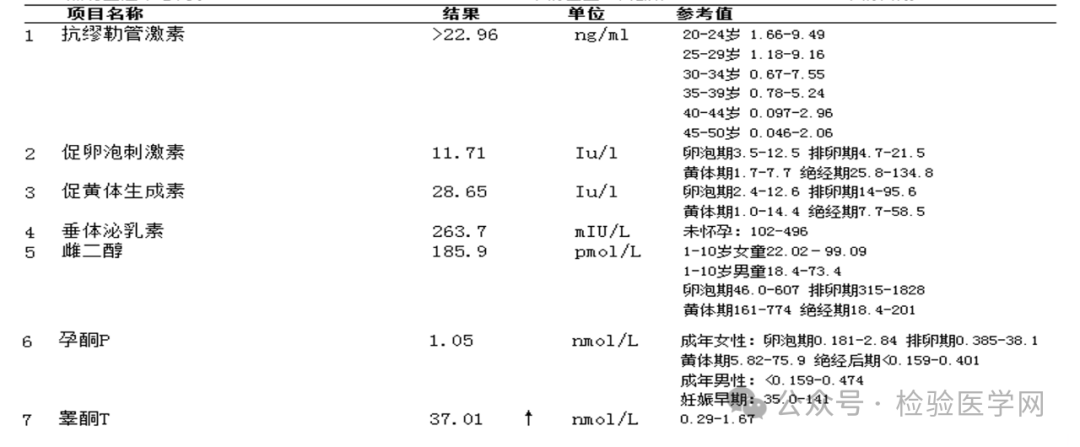 AMH >22.96ng/mL、FSH 11.71IU/L、LH 28.65IU/L、E2 185.9pmol/L、PRL 263.7mIU/L、T 37.01nmol/L、Prog 1.05nmol/L。
