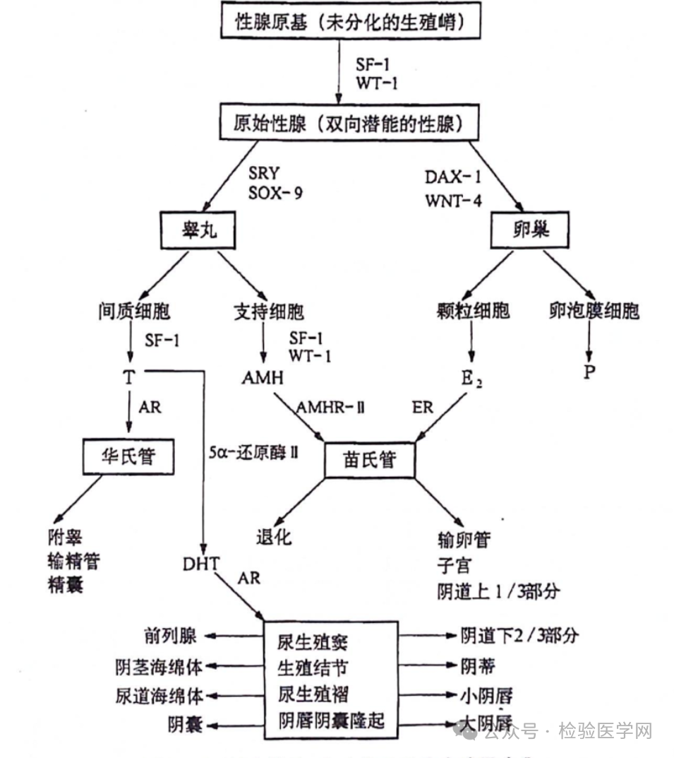 案例分析 育龄期女性睾酮主要来源于卵巢和肾上腺,各占25%,另50%由外周雄烯二酮转化而来。雄激素过高或活性增强会导致高雄激素血症,过高的雄激素可引发排卵障碍和生殖内分泌紊乱等疾病,出现月经不规律、生育力下降、多毛、痤疮、雄激素源性脱发和男性化等临床表现。睾酮升高常见于多囊卵巢综合征(PCOS)、先天性肾上腺皮质增生(CAH)、卵巢或肾上腺肿瘤等相关疾病。 本实验室性激素检测采用电化学发光法,首次检测所用平台为Cobas601,在报告单审核过程中,这例异常升高的睾酮引起了我们的注意。 为了确保结果的可靠性,我们首先就样本采集、条码粘贴、数据传输等方面分别进行核对,再查看当日两次质控情况及试剂情况,均无问题。根据我实验室复检规则:女性睾酮>3.0nmol/L时进行复检,将该样本更换至Cobas602复查,并通过倍比稀释的方式基本排除干扰和检测误差。 从正常成年女性的性激素结果来分析,该患者E2 185.9pmol/L、Prog 1.05nmol/L均为低值,表明患者目前无大卵泡,也不处于黄体期;FSH 11.7IU/L、LH 28.65IU/L均升高,LH升高更明显,但E2不高,可以基本排除排卵前的峰值;LH/FSH的比值升高,T、AMH均升高,多见于PCOS的患者,但PCOS患者睾酮罕见超过4.0nmol/L,而该患者睾酮达到37.01nmol/L,甚至超过了正常成年男性睾酮的参考范围(8.64-29nmol/L),如果用PCOS来解释,是明显解释不通的。 这个异常的激素结果我们可以发吗?患者是否有肾上腺相关疾病?是否存在明显的高雄激素临床表现? 带着疑问与临床医生取得联系,通过了解得知:该患者身高约165cm,体重55kg,血压正常,肤白,面部无痤疮,颈部无黑棘皮征,乳房有发育,乳头较小,女性特征明显且无男性化表现,外阴女性外观、阴毛稀疏;无雄激素相关用药史,无肾上腺皮质增生和卵巢肿瘤等高雄激素的相关病史及临床表现。 结合妇检无子宫及阴道呈盲端的临床表现及我实验室提供的性激素结果,初步推测,患者可能是由染色体异常导致的性发育异常,并且已开具外周血染色体检查及三维超声检查。 当日下午,妇科三维超声检查所见如下:盆腔扫查可见左右两个肌性组织回声,两个肌性组织回声团在宫颈方向相连,宫颈管显示不清;左侧大小5.5×2.4×3.2cm,包膜完整,内回声欠均匀,未见明显内膜样组织回声;右侧大小5.8×1.3×2.5cm,包膜完整,内回声欠均匀,未见明显内膜样组织回声;于肌性组织回声外上方各见一囊性结构,近髂前上极水平,大小分别1.8×1.4×1.9cm(左)、2.3×1.7×2.1cm(右),规则,内透声好。 雄激素不敏感综合征(androgen insensitivity syndrome, AIS)是由雄激素受体功能障碍引起的一种常见的性发育障碍,是一种多由染色体Xq11-12上的雄激素受体(AR)突变导致的以外周雄激素抵抗为特征的X连锁隐性遗传病。根据体内雄激素受体的缺陷程度,分为完全型(CAIS)、部分型(PAIS)和轻度型(MAIS)。 CAIS是AR基因突变最严重的异常应答,患者核型为46,XY,具有女性外生殖器外形,社会性别常为女性,体内没有子宫,阴道为盲端,性腺为睾丸,无月经初潮,阴毛和腋毛的生长稀疏或缺失,在青春期可见正常的乳房发育。其发病率高达1:20000-1:60000,常见于因青春期原发性闭经就诊,在原发性闭经的病因中排第三位,占6%-10%[1]。 在正常胚胎性腺、生殖管道及外生殖器的分化和发育过程中,随着原始生殖结构的出现,原始性腺具有双向分化的潜能,有2套生殖管道,即苗氏管和华氏管。 具有Y染色体的胎儿原始性腺向睾丸方向分化,睾丸的支持细胞合成分泌抗缪勒管激素(AMH),与苗氏管的AMH II型受体结合,诱导苗氏管退化;睾丸的间质细胞合成和分泌睾酮,与雄激素受体结合,诱导华氏管发育成附睾、输精管、精囊和射精管;睾酮在5α-还原酶的作用下转化为生物学活性更强的双氢睾酮,后者与靶细胞上的雄激素受体结合,使生殖结节、尿生殖窦和生殖褶等分化形成男性外生殖器;睾酮与雄激素受体的作用进一步诱导睾丸从腹腔下降至阴囊。 在女性个体中,由于胎儿无Y染色体、无SRY决定基因,原始性腺朝卵巢分化。由于无AMH及睾酮的作用,导致华氏管逐渐退化,而卵巢产生的雌激素与苗氏管上的的雌激素受体结合,诱导苗氏管发育成输卵管、子宫及阴道的上1/3部分。由于缺乏睾酮的作用往女性外生殖器发育,尿生殖褶发育为小阴唇,生殖结节发育为阴蒂。 对于雄激素不敏感综合征的患者,染色体核型为46,XY,SRY基因使患者的性腺向睾丸方向分化,所以分泌雄激素和AMH的功能是正常的;但由于雄激素受体AR基因异常,导致雄激素不能发挥其相应的生理功能,进而影响到华氏管分化成男性内生殖器,外生殖器的发育也受阻;而AMH及其受体是正常的,AMH可使苗勒管退化,所以患者盆腔空虚,无女性的子宫及其附件。