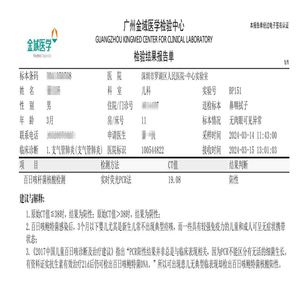 在制片的间隙,迅速查看了该患者的门诊病历。患儿,3月龄,急性起病。 主诉:咳嗽咳痰11天。 现病史:患儿11天前出现咳嗽,白天、晚上俱咳,咳时连声,有黄,无鼻塞流涕,无发热,无呕吐腹泻等症状,在家予对症治疗无改善。 既往史:否认近日流感患者接触者。否认蚕豆病、地中海贫血等病史,否认麻疹、水痘、腮腺炎、结核乙肝等传染病史。否认食物、药物过敏史。否认家族遗传史。 过敏史:否认药物、食物过敏史。否认家族遗传病史。体格检查:T36.3℃神清,精神可,面色红润,皮肤无皮。呼吸平稳,充血(++),咽峡部未见疯疹,双侧扁桃体无肿大。双肺呼吸音粗,可闻及痰鸣音,未见及哮鸣音,心腹查体、神经系统查体未见异常。 初步诊断:1.支气管肺炎。 查看生化免疫结果:肺炎支原体:阴性。13种呼吸道病原体多重检测:阴性。 相关检测结果未发现任何异常,那到底是什么原因导致小儿咳嗽不止呢? 当该患儿血涂片中的裂隙淋巴细胞进入我的视野,才渐渐解开了这迷雾缭绕的咳嗽之谜。 镜检200个白细胞可见约5%的裂隙淋巴细胞:该类细胞胞体圆形或类圆形,体积较小,胞质量少,呈蓝色或者浅蓝色透亮,无颗粒;细胞核型不规则,核染色质浓缩且致密,无核仁,部分核上有明显的深切的裂隙或者深裂缝,裂隙(裂缝)贯穿整个细胞核,有的出现双核样或不对称的双核样。 (瑞氏染色,×1000) 我们将镜下见到裂隙淋巴细胞告知临床医生,考虑百日咳杆菌感染的可能性较大。为进一步明确诊断,将该患儿的鼻咽拭子送检广州金域医学检验完善百日咳核酸检测,检测结果为CT