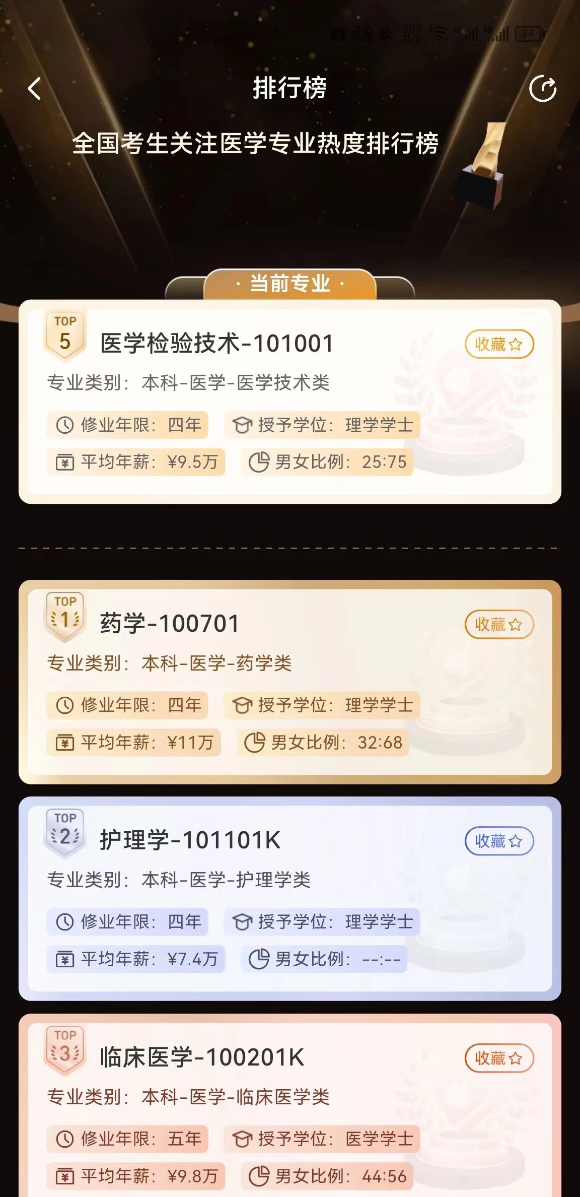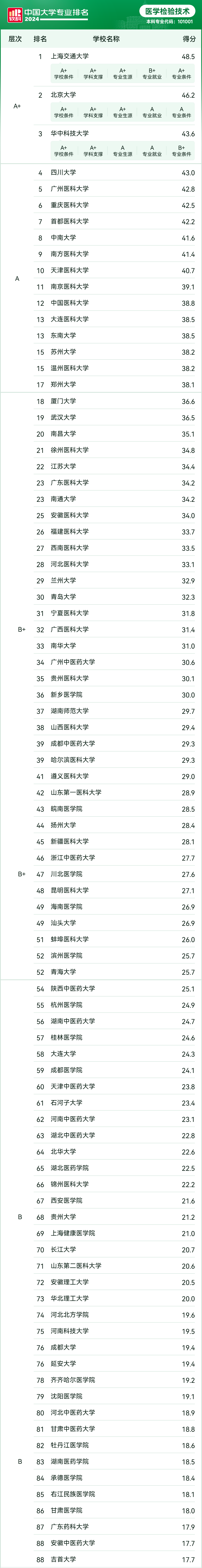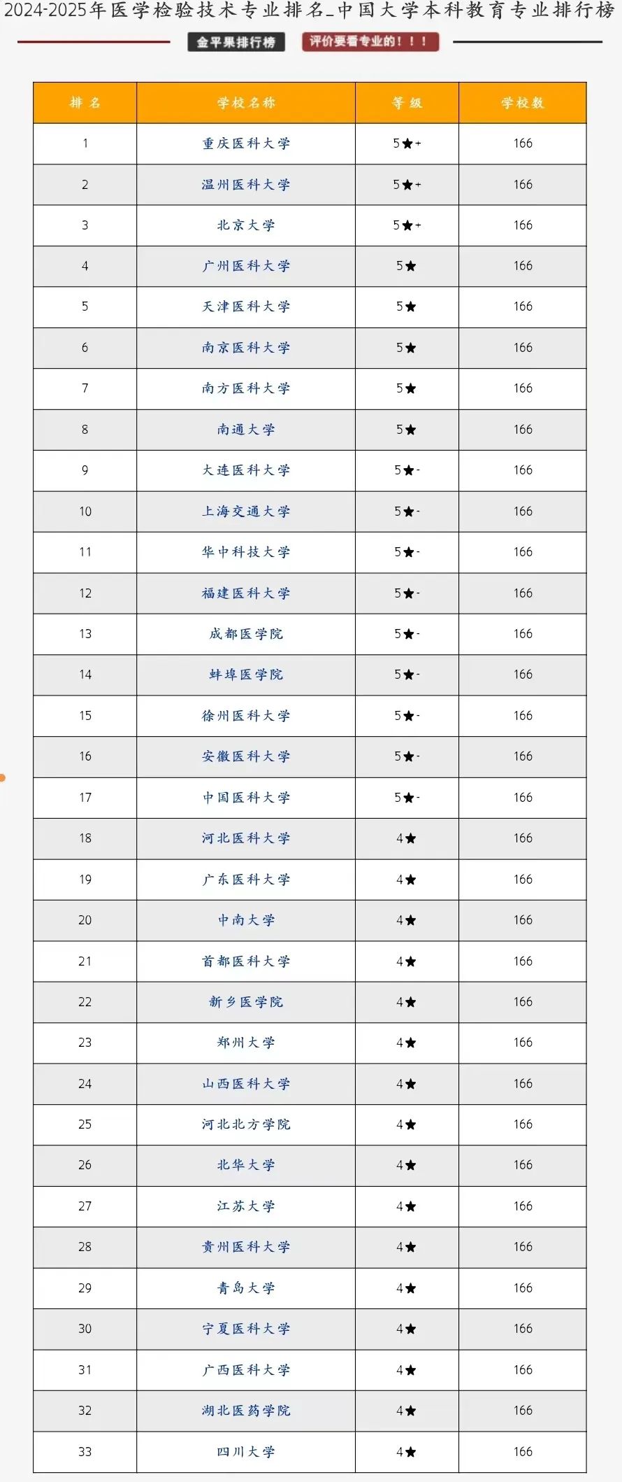 这两天,各地高考开始放榜,几家欢喜几家愁~ 有人笑成表情包 图片来源:共青团中央 有人失意拉二胡 图片来源:腾讯新闻 高考后无论得失,都需要面对择校选专业的问题。 就如今的就业形式,劝人学什么都容易被怼,现在网上可不敢随便发言了。实事求是的说,现在检验的就业情况相比较而言也确实更加严峻一些,更不好大力推荐了。 这几年检验的社会认知度有一定提升,根据掌上高考用户数据,医学检验技术专业已经位列全国考生关注医学专业热度排行榜第五位。 但每年入学检验专业的学生仍有很大一部分是调剂过来了,对行业的了解比较少,这一点从各大网络平台上咨询检验专业具体情况的帖子都能看出来。咱更希望给这部分学生多介绍一下本专业。 目前,全国高校开设医学检验技术(本科)专业的已经有179家。 这么多学校孰强孰弱?我们可以参考一下各路来源的大学专业排名。 现在国内做大学专业排名的机构有不少,各自有各自的评判标准。我这里都给大家列出来看一下。 首先是最早将医学检验专业纳入排名的“金苹果”中国大学本科教育专业排行榜。由杭州电子科技大学中国科教评价研究院和浙江高等教育研究院、武汉大学中国科学评价研究中心和中国科教评价网联合发布。 资料来源:中国科教评价网。该排行榜的星级标记体系由5★+、5★、5★-、4★、3★、2★、1★组成,分别对应于中国大陆2727所大学435个专业评价排名的前1%、1-5%、5-10%、10-20%、20-50%、50-90%、90-100%的专业。 这份榜单自2012年开始给检验专业排名,历史最久,纳入学校也最多达到166所。 另一份是由高等教育专业评价机构软科正式发布“2024软科中国大学专业排名”,在医学检验技术专业排名中,共有88所高校上榜。 软科排名指标体系设置学校条件、学科支撑、专业生源、专业就业、专业条件5个指标类别,共25项测量指标。 还有全国第三方大学评价机构艾瑞深校友会网发布《2024中国医药类大学一流专业排名》。依据中国高校办学定位、学科专业建设水平和本科专业发展定位,按“研究型”和“应用型”2个类型进行评价。 可以看到不同榜单的排名差距还是相当的大,当然结果也仅供大家参考。 什么样的专业是好的专业?大家公认的几个点: 首先是就业对口且工作轻松稳定。这点检验专业作为医学大类中的一个分支,这方面的优势是显而易见的。毕业后无论是在医院、疾控还是第三方实验室,专业对口自不必说。 而且在医学专业中,检验相较临床、护理工作,工作强度更低、压力更小,而且体制内的工作在稳定方面自不必说。也是因为这些优点,女孩子适合学检验都快成是行业的一种【刻板印象】了!行业内也是女多男少,男生在就业升学中确有一定优势。 再来好找工作,也就是行业人才需求要旺盛。这方面以往也许可以称得上是检验专业的一个优点,但是现在不行了! 疫情3年,检验行业因为新冠核酸检测产生的巨大需求而快速扩张,如今新冠核酸不再,全行业上下游人员过剩的情况都比较普遍,今年的应届毕业生的就业情况也称得上是史上最差,可以说疫情期间检验的就业有多热,现在就有多惨!检验君之前有专门发过文章介绍,感兴趣可以找来看看!而且检验行业人员更新比较缓慢,这种情况在短期内可能难以改变。 当然我们也要强调的一点就是,目前这种短时间内的就业挤兑主要集中在本专科的就业上,硕士、博士研究生阶段受到的影响相对较小。可以预见的是,今年检验专业考研的竞争激烈程度恐怕也将是空前绝后的!(这里建议今年的考生可以适当调低预期) 性价比高,在大致同等水平的考生就业中有一定竞争力。说白了,就是薪酬待遇。这方面检验的竞争力有但是不多。关于薪酬待遇,业内有一句话确实很贴切:吃不饱,饿不死! 干检验,想要挣大钱不是没可能,但确实比较难。检验就业后的待遇更多取决于医院和所在地区。一般来说检验人的薪资在当地人平均薪资之上,经济相对发达地区或者省会三甲医院月入过万基本没有问题。当然学历的影响也是有的,博士毕业的话大多数医院都能给编,即使是不直接就业选择入站做博后,一年20~30万也很正常。知乎上有个网友的评论我觉得还蛮有意思的,这里分享给大家: 冲一冲照样可以飞黄腾达上王者,摸摸鱼也有小康生活作保底。 检验目前的培养方式只有两种,一种是医学检验技术专业,本科四年制,理学学位。是的,虽然是医学生,但是拿的是理学学位,这也是目前饱受争议的点。如果分数够的话,现在确实更推荐大家报临床专业,硕士阶段再转检验。 另一种是八年制的检验医师培养试验班,采用“临床医学本科+临床检验诊断学专业硕士”培养方式,今年是第三届招生。 本科阶段为五年制临床医学专业,优秀毕业生获得学校推免资格后进入临床检验诊断学硕士专业学位培养阶段。毕业后“四证合一”,毕业可获得学位证、毕业证、规培证和执医证,含金量很高,而且在培养周期上也比其他学生领先一大步!作为检验医师的预备队,这些学生未来在就业时的竞争力也会明显强出一截! 目前国内仅有五所高校设有,分别是重庆医科大学、中国医科大学、温州医科大学、北京大学和四川大学。但是每个学校的招生名额都只有30人左右,从这2年几个学校的招生情况来看,录取分数还要略高于临床医学专业。 |