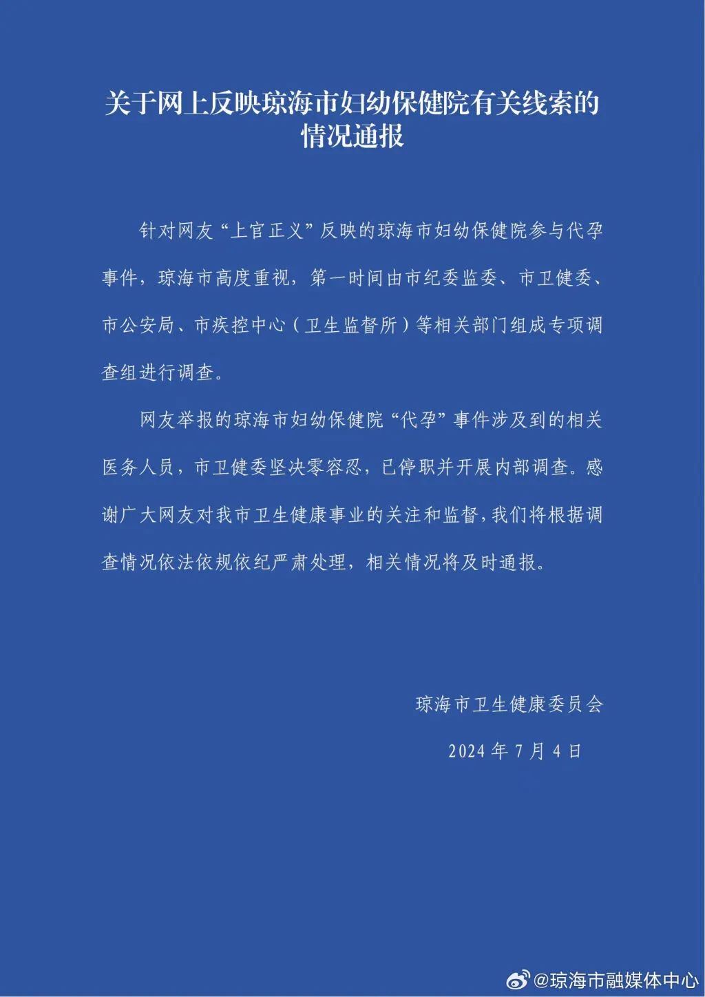 7月4日,据琼海市融媒体中心消息,海南省琼海市卫生健康委员会发布《关于网上反映琼海市妇幼保健院有关线索的情况通报》。 通报称,针对网友“上官正义”反映的琼海市妇幼保健院参与代孕事件,琼海市高度重视,第一时间由市纪委监委、市卫健委、市公安局、市疾控中心(卫生监督所)等相关部门组成专项调查组进行调查。网友举报的琼海市妇幼保健院“代孕”事件涉及到的相关医务人员,市卫健委坚决零容忍,已停职并开展内部调查。将根据调查情况依法依规依纪严肃处理,相关情况将及时通报。 (图片来源 微博 ) (图片来源 微博 ) 该机构称这些代孕的女性为“志愿妈妈”,捐卵的女性为“卵妹”。小编不禁想怀孕还能当“志愿者”? 据报道,国内代孕中介超过400家,一次费用40万至135万。主要根据外貌、身体健康、学历综合定价。 代孕的方式一般有三种: