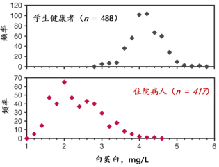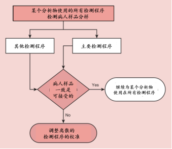 对多个仪器或检测程序间结果验证一致性 作为QC过程的一部分,另一个共同使用病人结果是,在相同医疗机构系统内某个被测量使用了多个仪器或检测程序检测,去验证病人结果的一致性。即使来自相同厂商的相同检测程序,验证结果一致很必要。实验室管理规范要求,为相同被测量的多个仪器或检测程序检测系统,尽可能,被校准到为病人样品产生相同结果。有必要修改某检测程序的校准设定,这样病人样品的结果将与另一个检测程序的结果是等同的。这个做法允许使用一个共同的参考区间,提供了不同实验室检测地点间结果的连贯性。 正如图6.15展现的,在两个或以上的检测程序的每一个检测临床病人样品分样,去验证病人结果的一致性评价,和必要的话,按照需要调整校准或使用检测后纠正功能,去实现病人样品结果的一致。这样的分析设计被称为“循环调整和验证”。选定一个程序代表主要的检测程序(或被指定为比较的检测程序),其他的检测程序将被调整达到等同的结果。该主要的检测程序的选择应依据结果的质量和可靠性,并考虑它的校准溯源性到国家或国际的系统、它的性能稳定性、它对分析物的分析选择性、和它对干扰物的敏感性。一个替换的方式是,评价每个检测程序与所有检测程序均值的一致,并有必要调整任何检测程序的校准,以产生组间的等同结果。 图6.15 评价检测程序间的一致,并调整校准,若必要,去达到不同检测程序间的等同。 对于进行循环调整和验证交换中使用的样品数,没有明确的指导。实验室需要建立评价的频率和样品数,依据检测程序的稳定性、试剂和校准品批号更换的频率、和卫生诊疗系统的对结果预期临床用途等。通常做法包括一个或多个各个病人样品的循环调整和验证,或多个样品形成的混合血清,以每周为基础进行的大容量检测程序;或每月或每季度对较低容量或非常稳定的检测程序。为了经常比较一个或多个样品,应选择浓度去评价一个阶段几个检验的检测区间。对于较低频率的比较,建议可覆盖检测区间的大量病人样品。当建立解释指标时,实验室需要考虑对可用的结果数的有限统计功效。CLSI EP31提供了统计方式适用于比较中的一个到五个样品。 表6.5 提供了一个示例,在一个作者的实验室里评价多个分析仪间对单个病人样品每周检测间的一致性。建立这些指标是依据使用的检测程序预期的不精密度和离散结果对临床决定的影响。为了允许在比较中一个单一样品的单一检测的局限性,对一个结果超出某个指标一般不采取措施,除非差异的大小非常大地超出了指标,或情况持续了2周以上。 建议使用病人样品去验证多个检测程序或相同类型仪器间的一致,即使来自相同厂商。QC物质的结果不应用于该目的,因为这是验证不同检测程序或仪器检测的病人样品结果的一致。正如前述,QC物质没有被确认与病人样品在不同检测程序间是可互换的。即使用了来自相同厂商的多个检测程序,QC物质被检测的值在不同试剂批号和不同仪器间会看到差异。原则上,如果使用了多个相同模式的一个仪器,与相同的试剂批号,在相同批号的QC物质间应具有相同的结果。在实践中,检测差异的细节或在不同仪器间的保养情况,经常引起QC结果的小差异。可设定这样差异的QC结果的可接受指标。但是,只有使用病人样品去评价不同仪器间的一致,才可作出较可靠的结论。 使用病人数据的统计质量控制 病人结果可以用于统计QC过程,去监视检测程序性能。有足够大量的结果数,均值(或最好是中位数)的值会足够稳定,被用作整个时间检测程序一致的指示。这个方式被用于一个定期的基础,在一个特定时间期间提取数据(如,1天、1周、1月,取决于可用的结果数),计算均值和结果分布的SD,比较一个时间阶段与另一个阶段的结果,确定是否已经发生了变化。这个类型的定期评价可证实在校准稳定性的改变,或一个检测程序的总的不精密度。均值和SD也可在相同被测量的两个或更多的检测程序间进行比较。 使用病人数据去评价在单一检测程序或在被测量的不同检测程序间的一致的重要局限性是,结果的生理均一性。图6.16说明了一个示例,在医院内科住院病人,与门诊健康学生的比较,直方图差异非常大,因为两个病人群组在疾病严重性,和血液收集时的体位(卧位和仰卧)的差异,影响了血管水的体积和白蛋白的浓度。使用病人数据进行白蛋白检测的过程控制,类似于其他被测量,要求将病人人群分为一个均一亚组。 已经报告以自动方式去使用系列病人结果的均值(或中位数),作为连续过程控制参数。这些方法被称为“正常平均值(average of normals)”(misnomer用词不当,因为不是所有结果来自正常个体)或“移动均值”技术,适合用于在临床化学和血液学中有较大检测标本量的检测程序。一般,这些方法评价的整个时间内的连续病人结果,从几分钟到数小时,或几天。使用的时间区间是可信的,取决于这个时间区间内结果的个数,在病人结果中代表的临床情况相对均一。对一些被测量,病人会需要被分组,得到的亚组,内含的结果预期是均一的。考虑分组的包括年龄、性别、种族、和疾病情况。在监视一个实验室较比较多个实验室,得到均一组较容易。一些方式任意地无视不正常结果,试图限制结果为较正常的健康情况。去除不正常结果使用时必须引起重视,