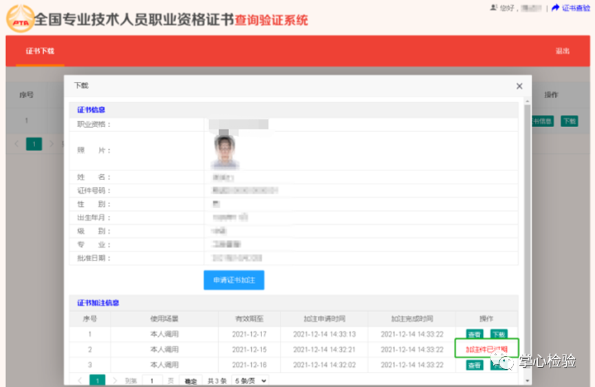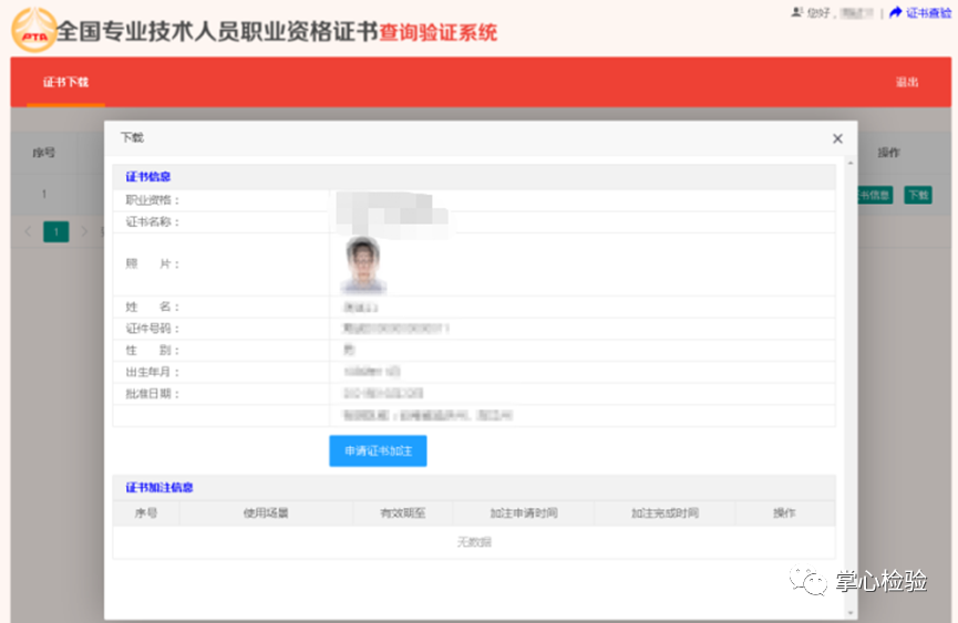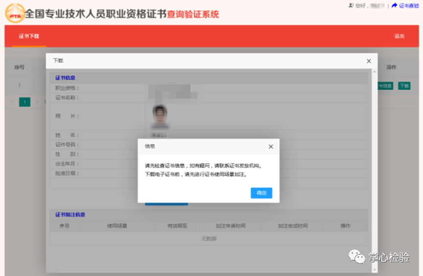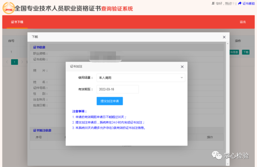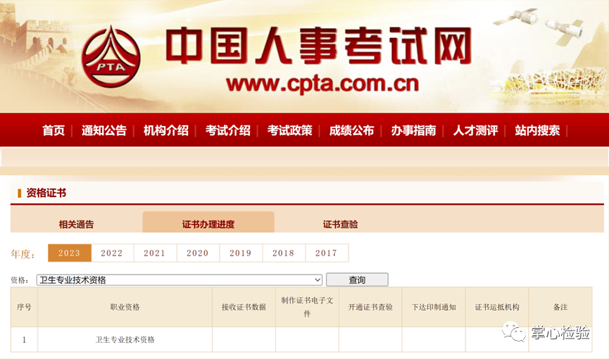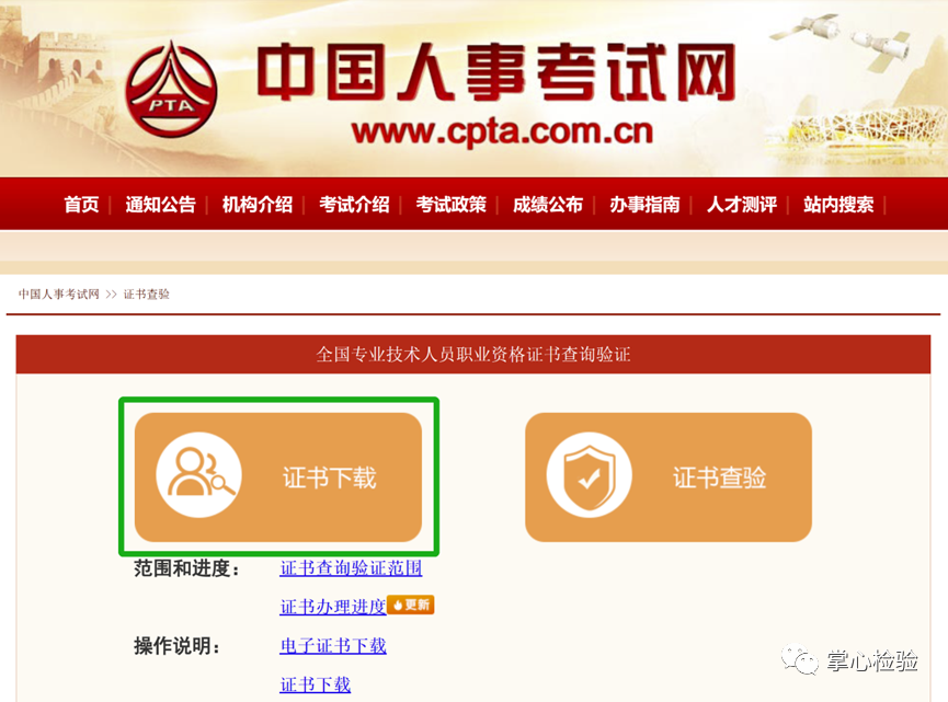 如果你单位认可电子证书,抓紧下载下来,交给人事科吧! 搜索并点击进入中国人事考试网官网(链接:http://www.cpta.com.cn/)(如下图所示)。 点击左侧菜单栏中的[证书查验](如下图所示)。 点击[证书下载](如下图所示)。 进入[登录]页面(如下图所示)。 如果是首次登录该网址下载电子证书,首先需要点击 绿色图标的[用户注册],进入到如下图所示的页面,信息全部填写完成后,点击[提交]。 注意:注册时需要填写短信验证码,手机会收到一条验证信息,开头是[支付宝],落款是[人社部考试中心],正常填写即可,如果实在担心不可靠,就不要填写注册了。 首次注册完毕后,返回到[登录]页面,输入用户名、密码、图形验证码,点击[登录],会看到如下图所示的页面。 阅读该服务须知,对本页内容进行了解后,点击[同意须知],即可进入证书下载页面(如下图所示)。 如果之前登录过该网址 并且下载过电子证书,那么是之前已经注册过,不必再次注册(再次注册时会提示已经注册),输入用户名、密码、图形验证码,点击[登录],即可进入证书下载页面(如下图所示)。 如果是之前注册,现在忘记了当初注册的用户名和密码是什么,点击 蓝色图标的[找回用户名],或者点击 红色图标的[找回密码],进入到如下图所示的页面。 可以看到,官网提供了两种密码找回方式,可以用自己当初注册时,填写的预留问题进行找回,也可以使用短信验证码进行找回,两种方式选择其中一种就可以,按照要求,输入相应信息,即可重置密码,返回到[登录]页面,输入用户名、密码、图形验证码,点击[登录],即可进入证书下载页面(如下图所示)。 证书状态为[有效],说明存在真实有效的证书。 在[操作]栏点击[证书信息],可查看该证书对应的信息(如下图所示)。 在[操作]栏点击[下载],进入电子证书加注、下载页面(如下图所示)。 申请证书加注前,请先检查证书信息,如有疑问,请联系证书发放机构。证书信息检查无误后,点击[申请证书加注],进入证书加注页面,选择使用场景、加注有效期,点击[提交加注申请],完成证书加注申请(如下图所示)。 注意:每次申请加注最长有效期为90天;如无特别需要,建议按上限申请;目前支持的使用场景为“本人调用”。 注意:自用户申请加注当日起向前计算,90天内同一证书最多可允许存在3次有效加注;请根据使用需求,合理申请加注。 加注申请提交后,系统将在24小时内完成证书加注(如下图所示),请耐心等待。 证书加注完成后,可查看或下载该电子证书。 在[操作]栏点击[下载],进入电子证书加注、下载页面。[证书加注信息]栏无数据,或者提示加注件已过期(如下两图所示),必须首先完成加注申请。 已完成加注,且加注处于有效期内的电子证书,可在[操作]栏点击[查看]或[下载],进行电子证书查看、下载操作(如下图所示)。 1.关于加注的问题 2021年12月17日之后制发的电子证书须经加注后方可下载和使用。 加注解释:加注是指在电子证书上设置使用场景和有效期信息。加注电子证书可防止电子证书非本人授权情形下的使用,保护持证人员权益。 自持证人员申请加注当日起向前计算,90日内同一证书可存在3次有效加注,每次申请加注最长有效期限为90天;如无特别需要,建议按上限申请;目前支持的使用场景为“本人调用”。 简单理解,就是在电子证书上标明使用场景和使用期限,以防滥用。 2.哪个文件/通知中说的,“电子证书与纸质证书具有同等法律效力”? ①人社厅发〔2021〕97号。链接: http://www.mohrss.gov.cn/xxgk2020/fdzdgknr/zcfg/gfxwj/rcrs/202112/t20211221_430806.html ②人社厅发〔2023〕16号。链接: http://www.mohrss.gov.cn/xxgk2020/fdzdgknr/zcfg/gfxwj/rcrs/202305/t20230530_500755.html 3.必须要下载电子证书吗?可以不下载吗?我不想现在下载,我可以过段时间下载吗? 电子证书的下载没有时间限制,随时都可以查看和下载,这点不同于成绩通知单的下载(点击查看:关于下载打印成绩通知单),所以什么时候下载都行,不下载也行,不是必须下载,仅在您需要的时候(比如:证明自己通过考试、找工作、单位转正/聘任、涨工资等)下载即可。不注册下载电子证书,不影响领取纸质证书;已经注册下载电子证书,不影响领取纸质证书(明确说明 只有电子证书、不发放纸质证书 的省市除外)。 4.提示加注件过期,怎么办? 证书加注完成后,有效期内可查看或下载该电子证书。超过加注有效期后,请重新提交证书加注申请。 5.为什么我的证书没有申请加注就可以查看和下载? 请加注,可以直接查看和下载。 6.证书下载页面显示为空白,是什么原因? 如果页面显示为空白,说明不存在证书信息。具体原因如下:①未取得证书;②已取得证书,但证书信息暂未上线。③在中国人事考试网“全国卫生专业技术人员资格考试报名服务平台”注册后,通过人事考试机构更正过姓名或证件号码。必须使用更正后的正确的姓名和证件号码重新注册。如果有疑问,可以联系证书发放机构。 7.我大概什么时候能领取到纸质证书呢?纸质证书的办理进度,我怎么看? 返回到如下图所示的页面,在 橙色方框[证书下载]下面可以看到两行蓝色字体,点击 蓝色字体[证书办理进度]。 进入到如下图所示的页面。 通过上图可以看到,接收证书数据、制作证书电子文件、开通证书查验、下达印制通知、证书运抵机构,分别是什么时间,如果在【证书运抵机构】那一列,出现了时间,就代表这个时间人