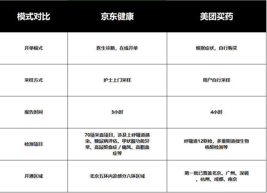 此次,京东健康互联网医院“线上开具检验单服务”首批包含70项采血项目,涉及上呼吸道感染、糖尿病评估、甲状腺功能异常、高尿酸血症/痛风、高脂血症等病种,服务范围覆盖北京五环内及部分六环区域。暑期刚至,一位8岁儿童突发急热,家长到京东健康互联网医院发起问诊。医生了解孩子的症状后,在线上为其开具了血常规+C-蛋白检验单以及呼吸道病毒细菌12联检。根据检验报告,医生认为暂时无需抗病毒或抗生素治疗,并给出了具体用药建议。此外,检验单显示该名患者红细胞两项略低,提示患儿可能铁储备不足,因此还给出了日常饮食的调整建议。京东健康互联网医院“线上开具检验单服务”上线之后,与此前京东另一项服务京东到家快检推出的上门快检服务形成了在线医疗服务闭环。据了解,去年冬季呼吸道疾病高发,京东到家快检第一时间推出了面向用户的“呼吸道病毒细菌12联检测”服务。这种检测模式链接了上游试剂厂商、下游医学检验实验室,并由京东健康提供专业的配送运力和采样服务。这一次,京东健康互联网医院将专业医疗检测延伸至线上问诊流程之中。通过这一服务模式,患者可以根据医生建议,结合自身情况,轻松完成进一步的专业医疗检测。由专业护士依据预约信息上门为患者进行采血或收集其他样本,医生再根据检测结果,给出更为精准的诊断和治疗建议。一个现实是,京东、美团官宣下场线上检验,虽然路径不同,一个致力打造“医检药”服务闭环、一个主攻居家快检,但相同点是:它们都将成为传统临床检验逻辑的颠覆者!显然,互联网巨头提供的是线上渠道,服务中涉及的就业需求和检测需求其实还是由医疗机构和第三方医学实验室提供。以外卖平台为例,医疗机构和第三方医学实验室实际扮演了外卖商家的角色,专业护士或者经过培训的配送员则扮演外卖员的角色。