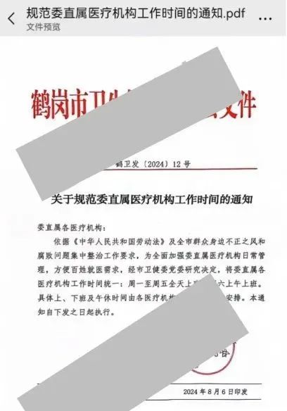 医院周六照常上班!其实很多医院一直是这样上班的! 近日,一份显示由鹤岗市卫生健康委员会发布的文件引起广泛关注。文件中显示,将委直属机构工作时间统一为:周一至周五全天上班,周六上午上班。 尽管医生们的工作时间显著延长,但对于这些增加的工作量,相关部门并未给出合理的补贴方案。医生们虽然习惯了周末上班,却仍希望能够得到应有的补偿。 有医院提出了“补休和补贴二选一”的方案,但大多数医生认为,这种做法更像是强制性加班。比如,超声科医生李华,认为这种提议实际上并未给予医生真正的休息时间和·经济补偿。 一些医生建议可以在周末门诊的绩效上提高,或者在职称评定时对周末上班的医生进行加分。然而,截至目前,对医生工作量的重视和实际补贴措施仍然缺乏统一标准和有力执行。 |