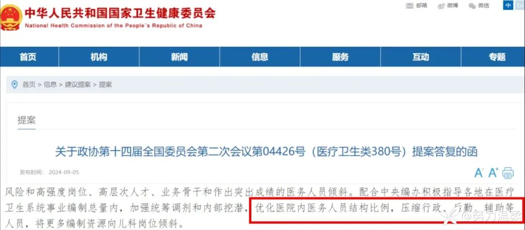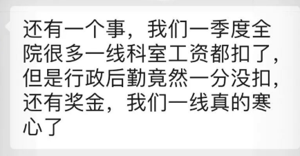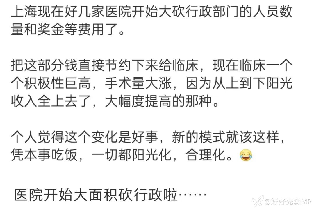 当然,也有不少后勤科室人员表示“只拿本院平均绩效”,或“并不比临床科室拿的多”。 经查询发现,医院后勤科室会按照不同性质、工作量大小、承担风险高低进行区分,而不同科室绩效工资分配系数存在差异。在这基础上,还会有职称、工龄、加班补贴等。总体而言,部分后勤人员的薪酬确实可能略高于部分临床科室。 但由于目前并没有强制规定医院后勤人员的薪酬不能高于一线医护,那么院内任何薪酬分配方式都有可能被提出。 据调查统计,我国医院的后勤人员和医院全体职工的比值平均为25%-45%左右,个别医院的后勤人员占比甚至超过了50%,这实在令人匪夷所思,要知道欧美等发达国家医院的这一比值仅为5%左右。 不过,虽然后勤绩效分的多,但在限制后勤人员绩效不超过临床医务人员方面,很多地区都发了文件。 例如,2024年1月15日,内蒙古包头市卫生健康委、市财政局和市人力资源和社会保障局联合印发并执行《包头市深化公立医院绩效薪酬制度改革工作方案(试行)》,重磅出台了医务人员绩效薪酬改革的十条措施,再次引发了业内热议。 其中,最引人关注的当属公立医院绩效薪酬的内部分配。方案指出:充分体现知识、技术、管理等要素的价值,体现医、护、技、药、管等岗位差异,合理拉开收入差距。其中,医技科室人员、护理人员、行政和后勤人员人均绩效薪酬不得高于临床医生平均绩效薪酬的80%、70%、50%。 其实,绩效无论怎么分都会有争论,正如一名医务人员所言:“不患寡而患不均,给谁分的多了少了都会有怨言……” 但不可忽视的是,临床医务人员的吐槽背后只不过是他们最简单的需求,拿到与自己的付出成正比的回报。如果连能够得到更加符合自身劳动价值的绩效都成了奢望,那谁还能保证以后有多少医务人员安心工作呢...... 最近在网上看到有人发帖称:“上海几家医院开始砍后勤人员的数量和奖金,节约下来的钱给临床了。不知道这个消息是否可靠,但是医院就应该如此,有钱才有积极性,很现实的问题,没钱干活也没积极性。” 图源:见水印 9月5日,国家卫健委发布的《关于政协第十四届全国委员会第二次会议第04426号(医疗卫生类380号)提案答复的函》明确回应:优化医院内部人员结构比例,压缩行政、后勤、辅助等人员。这一答复的发布也是对上述“裁减后勤等科室人员”的强有力的论述。 我们可以看到,在“有效划定后勤等非临床一线人员比例”的问题上,国家卫健委是有相应措施逐渐发布的。通过优化人员结构,医院能够更好地聚焦医疗主业,强化医疗技术和服务水平,为患者提供更加优质、高效、便捷的医疗服务,也可以将更多的医疗收入用在更有需要更一线的位置上。 |
