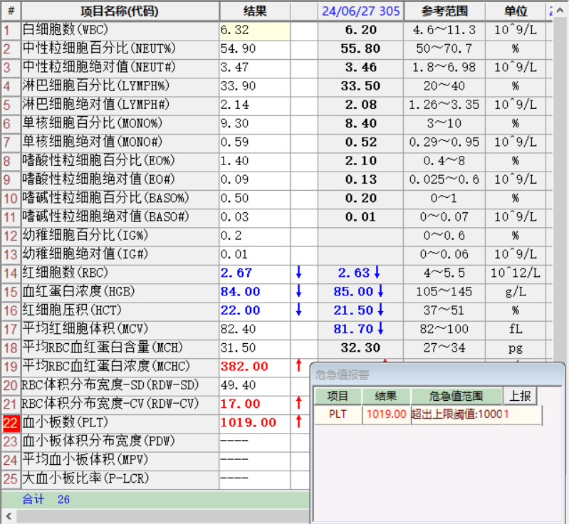 作者 | 梁杏,欧志荣,李浩月单位 | 广东省封开县中医院检验科 血小板计数是临床检验中常见的血液检查项目之一,对于指导血液疾病的诊断和治疗具有重要意义。然而,我们必须认识到血小板计数可能受到多种因素的影响。所以,当遇到特别异常的结果时,一定要慎之又慎,警惕假性结果! 患者简介,男,13岁,因发热到我院门诊就诊,既往有贫血史。全自动血细胞分析仪检测结果显示如图1,WBC 6.32×109/L,HGB 84g/L,血小板为1019×109/L。危急值?假性增高?这个结果可以直接审核吗? 图1 原血常规数据图 如图2、3所见PLT直方图显示异常,出现翘尾的异常现象。RBC的CV值也偏高,难道是小红细胞干扰?红细胞碎片干扰? 图2 原数据PLT直方图 图3 正常PLT直方图 按照实验室血常规关于血小板复查规规则[1],首次出现PLT>1000×109/L或<100×109/L,需要对血小板进行复查。 马上用本实验室另一全自动血细胞分析仪网织红检测通道进行复检,结果如图4,PLT-I(电阻抗法)——1028×109/L,PLT-O(光学法)结果234×109/L。两个结果相差如此之大,哪个是真实值?该报哪一个检测结果? 图4 复查数据结果和PLT直方图RBC直方图 图5 RET散点图 图6 正常RET散点图 取该标本推片瑞氏染色之后人工镜检,显微镜下可以看到血小板在正常范围内,且无聚集现象,但红细胞大小不均,如图7-10可以看到有小红细胞和红细胞碎片。 图7 外周血,瑞姬染色,×1000 图8 外周血,瑞姬染色,×1000 图9 外周血,瑞姬染色,×1000 红色箭头:血小板,绿色箭头:裂片红细胞。 镜检发现了大量碎片红细胞。根据油镜下血小板数量估算公式[2],该患者的血小板计数大约220×109/L。与第二次光学法(PLT-O)234×109/L检测结果最为接近,最后报告光学法的血小板结果。 该患者检测血小板(电阻抗法)结果1019×109/L,与镜检结果不相符,另外一台血球仪网织红通道(光学法)结果234×109/L,与镜检结果相符。为何两种不同方法学的检测结果相差如此之大?这或许就要从这两种方法学的原理找答案了。 阻抗法(PLT-I)是根据颗粒体积大小通过小孔时产生的脉冲信号不同来区别和计数血小板,正常血小板直径为直径2-4μm,而大多数已知细菌的直径在0.4-2um之间,即使是细菌成团,也远远不够正常血小板的大小,故PLT-I检测值最低也最为接近真值。但当血液中存在大量小红细胞和红细胞碎片,由于其体积和血小板体积接近,仪器也会归类为血小板,这也是导致血小板假性升高的常见原因。 光学法(PLT-O)和荧光核酸染色法(PLT-F)采用了流式细胞术原理[3],根据对血小板核酸成份的荧光染色,测定荧光强度来计数血小板,能够消除小红细胞或红细胞碎片的干扰,其中光学血小板法使用聚甲烯次甲基荧光染料对血小板进行荧光染色,通过网织红通道RET进行测量,利用表达细胞大小的前向散射光FSC和表达核酸浓度的侧向荧光SFL来识别血小板。 该方法经过染色后能有效排除电阻抗法无法排除的部分颗粒的影响,具有对小红细胞、红细胞碎片、大血小板和乳糜微粒等抗干扰能力强的特点。但有研究表明PLT-O只要细胞碎片足够小且足够多,也会干扰到这个通道的血小板计数[4]。 一、引起血小板假性增高的原因可能有以下几方面[5]: 1、仪器方法学错误:由于红细胞和血小板在同一个通道内计数,当红细胞的体积过小时以及外周血中有较多的红细胞碎片时,仪器不能准确区分红细胞和血小板,局限性的将一些非血小板小颗粒当成血小板进行计数,从而引起血小板的假性升高。 2、冷球蛋白血症患者血浆中存在冷球蛋白,血液涂片可见大量粗大血浆球蛋白颗粒,红细胞均呈细钱状或团块状聚集,这些小颗粒被误认为是血小板从而使计数增高。 3、可能的与某些疾病有关,如慢性粒细胞患者经过治疗后,血液内会出现大量的红细胞碎片,这些碎片也会干扰血小板计数,使其结果假性增高。 4、高脂血症的患者以及静脉滴注脂肪乳的患者可能是由于仪器将乳糜微粒误认为血小板进行计数[6]。 5、大部分全血细胞计数仪受其功能的限制,并不能完全真正的将血小板和非血小板颗粒分开,从而将非血小板颗粒当成血小板计数进去,导致血小板假性增高[7]。 二、遇到血小板假性增高时的处理措施有以下几种: 1、采用荧光法进行复查。血细胞分析仪测定血小板的方法有三种:阻抗法(PLT-I)、光学法(PLT-O)和荧光法(PLT-F)。 2、手工计数法:按照第4版《全国临床检验操作规程》的操作步骤计数计数板中央大方格内四角和中央5个中方格内的血小板数,按照公式:血小板数/L=(5个中方格血小板数)x5x10x20x106计算血小板结果。 3、血涂片镜检:对结果有疑问的血常规标本进行血涂片瑞氏姬姆萨染色显微镜镜检,至少观察10个视野,计数所观察视野中血小板总数,计算每油镜视野中血小板平均数量,则血小板估算值(x109/L)=每油镜视野血小板平均数xRx109/L。公式中R值又称视野因子,传统取值为20,国内专家推荐15。 血小板结果的准确性对于血栓性疾病和出血性疾病的诊断与治疗起着决定性作用,也经常遇到血小板假性升高的案例,所以也就要求检验人员对报告审核需严谨慎重。 遇到可疑结果要及时对标本进行复查和临床沟通情况。不仅仅是审核最终仪器传出的数值,对于仪器给的其他信息也要重视,血常规里面的散点图,直方图,报警信息等都需要我们的关注。 根据本次案例知道,红细胞碎片干扰时,对阻抗法(PLT-I)检测通道极大干扰,在仪器方面可以用光学