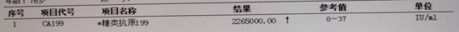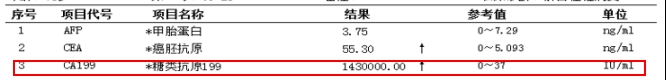 CA19-9是肿瘤相关的抗原,胚胎期间胎儿的胰腺、肝脏、胆囊、胃肠等组织中存在这种抗原,正常成年人的胰腺、肝胆、胃肠以及唾液等器官的上皮细胞中也可微量分泌。 CA19-9是消化系统最常见的肿瘤标志物之一,是胰腺癌、胆囊癌等恶性肿瘤的敏感指标,在其他部位的恶性肿瘤如肺癌、卵巢癌等也可多见。血清CA19-9是胰腺癌最重要的血清学指标,被认为是胰腺癌的“金标准”[1]。 案例经过