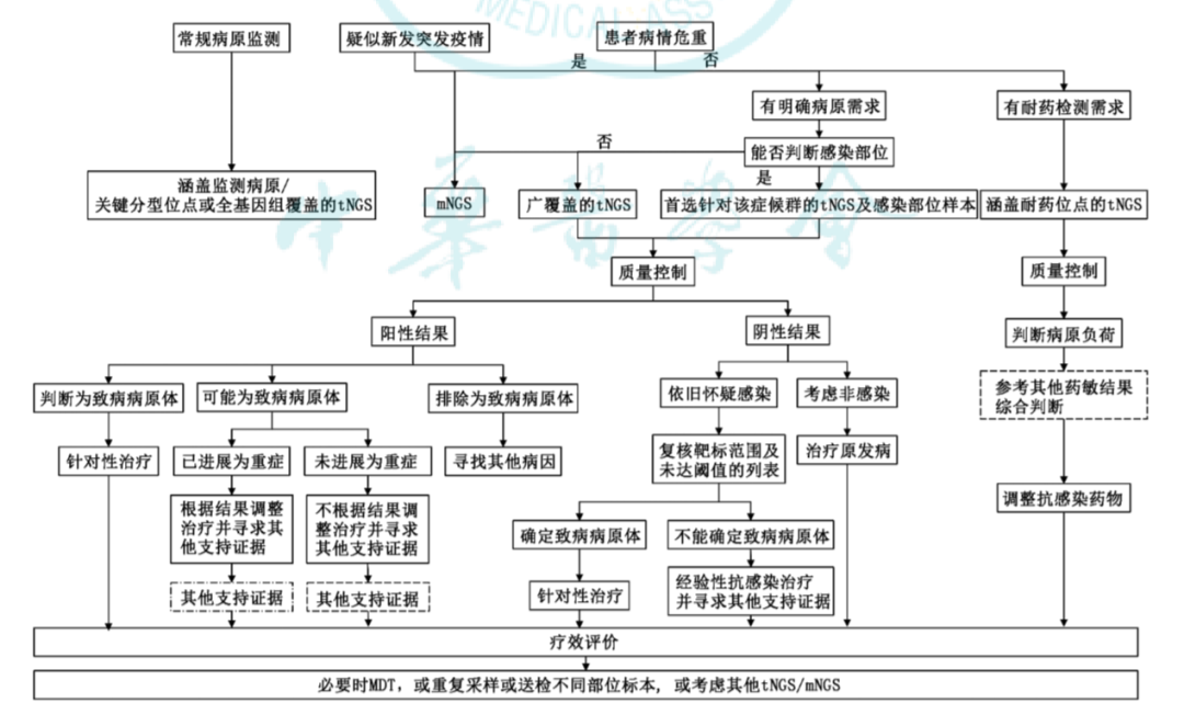 tNGS/mNGS选择及tNGS临床解读处置流程 注:tNGS为靶向高通量测序;mNGS为宏基因组高通量测序;MDT为多学科诊疗 《共识》还强调了tNGS的临床报告的正确发放和科学解读对于临床决策至关重要。其建议组建包括微生物实验室技师/医师和临床医师的团队,在报告过程中,建议针对不同标本和感染类型建立病原解析库,建议结合标本类型、病原种类、均一化序列数等指标进行报告解读,在临床信息基础上判断该病原的致病等级。