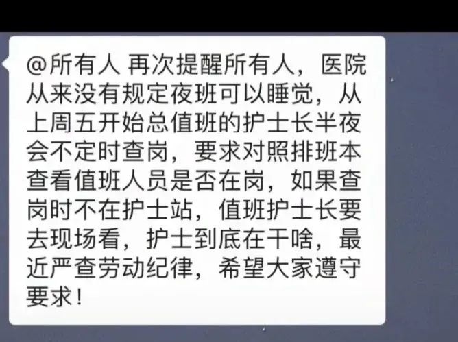 不知怎么回事,近期我们发现越来越多的医院开始对医务人员的工作时间卡的很紧,考勤近乎严苛,甚至不讲情理,令许多医务人员难以接受。 近日,吉林一名医务人员在网上发文表示,以后上夜班都不能睡觉了,原因是医院总值班发了通知,说上夜班时睡觉不合规! 通知显示:再次提醒所有人,医院从来没有规定夜班可以睡觉,从上周五开始,总值班的护士长半夜会不定时查岗,要求对照排班簿,查看值班人员是否在岗,如果查岗时不在护士站,值班护士长要去现场查看护士到底在干啥。最近严查劳动纪律,希望大家遵守要求! 值夜班时究竟能不能睡觉? 本以为值夜班时不让医务人员睡觉是个例,没想到这种情况早已普遍。 8月16日,陕西一名医务人员在小红书也发文表示,医院发了文件,说以前睁一只眼闭一只眼也就算了,从本月起,值班人员不能离开岗位,要挺拔身姿、打起精神,发现值夜班期间离岗休息或者不在岗位者,发现一次罚款100,发现两次直接记过。 在相关评论区,一名医务人员表示,他们医院虽然允许值夜班时睡觉,但是不能全程睡觉,为了防止睡得太死,要3小时打一次卡,一夜必须起来好几次,就算没有病人也得起来打卡,睡觉断断续续的,相当于没睡! 天呐,一个值夜班时不能睡觉、违者罚款,另一个可以睡觉,但要3小时打一次卡,这也太折腾人了。 如此辛苦的状态下 越来越多的医院“盛行”取消夜班费 夜班持续忙到早上临近五点,去值班室躺一下,人困到一躺下就恍惚眯过去了。急诊的门铃响起来,惊醒,赶紧起来穿工作衣、戴口罩…… 出来赶紧接标本,病人一直碎碎念,我解释说起来要穿衣服戴口罩戴眼镜这些,患者直接开骂了,然后投诉我「工作态度差,急诊十几二十分钟才出来接标本。」后来监控调出来,从按门铃到我接标本总共2分40秒……是我的错! 以上这段文字,是一位检验科最普通的工作人员的原话。“持续忙到五点”“困到一躺下就恍惚眯过去了”“惊醒”“患者投诉”“2分40秒”“是我的错”,大家看看,这些从原话里直接摘出来的文字单个来看哪个不伤人心?哪个不直击医务人员的心灵。 可是,当投诉交到医务处的那一刻,谁会在乎你持续忙到了五点,谁会在乎你只用了两分四十秒就接到了标本?他们只会说:为什么值夜班时你不在岗位上呆着,还敢睡觉? 周末节假日工作补助提高至260元 就在大小医院忙着降本增效,比着降薪、比着减少补助的时候,我们庆幸地看到,终于有影响力巨大的头部医院光明正大、实实在在地给医务人员提高了薪酬补助,令人振奋! 10月15日,北京大学人民医院发布了《关于调整夜班补助及周末节假日工作补助的通知》,其中表示,为促进医院发展,进一步提高医院职工待遇,经2024 年9月30日院长办公会、党委会讨论,决定调整夜班补助和周末及节假日工作补助标准: 1. 提高夜班补助标准,其中临床医生调整为260元/夜班;护理人员调整为210元/班次;行政后勤人员调整为150元/夜班;临床医技科室参照临床医生标准执行。 2. 提高病房周末及节假日工作补助标准,其中临床医生调整为260元/白班;护理人员调整为210元/白班;行政后勤人员调整为150元/白班;临床医技科室参照临床医生标准执行。 3. 提高门诊周末及节假日工作补助标准,未直接参与门诊工作的医疗辅助人员及行政人员节假日工作补助标准调整为75元/半日;其余直接参与周未及节假日门诊工作人员,补助标准根据当期当院区周末及节假日医事服务费收入20%的金额及各部门分配比例确定。 |