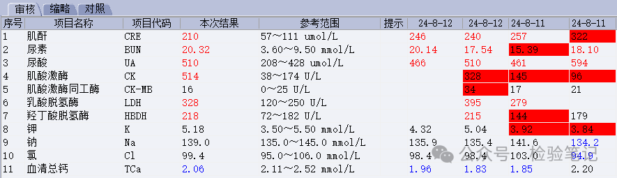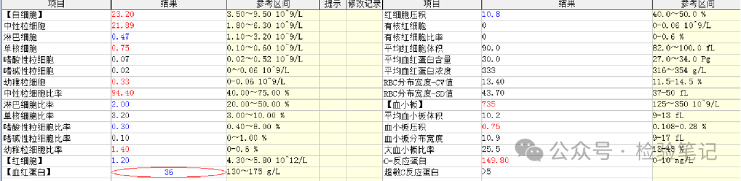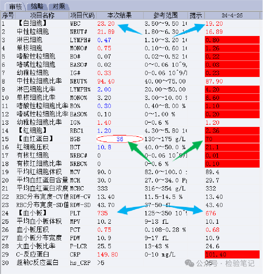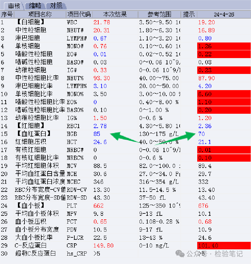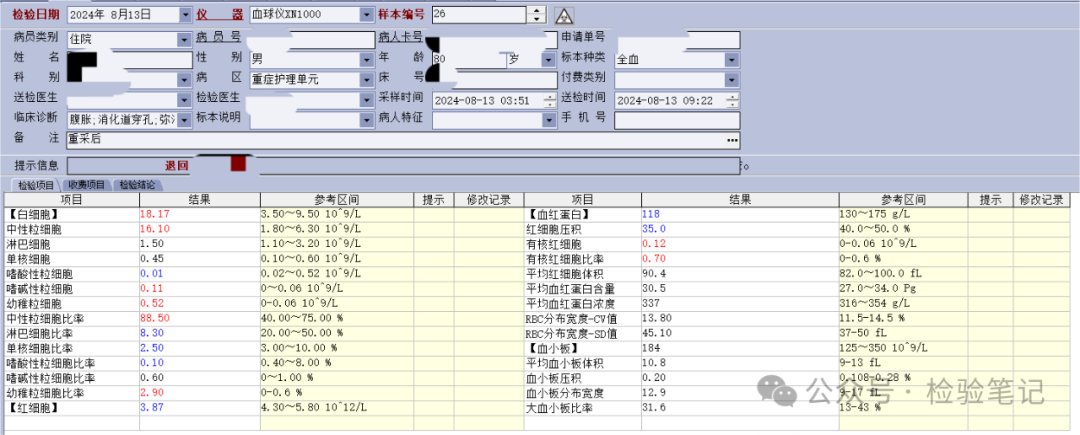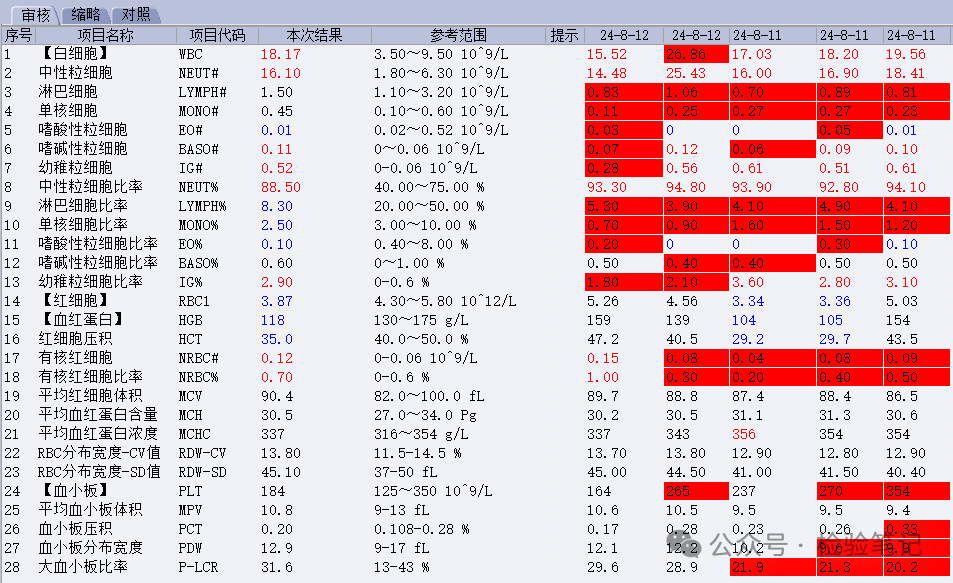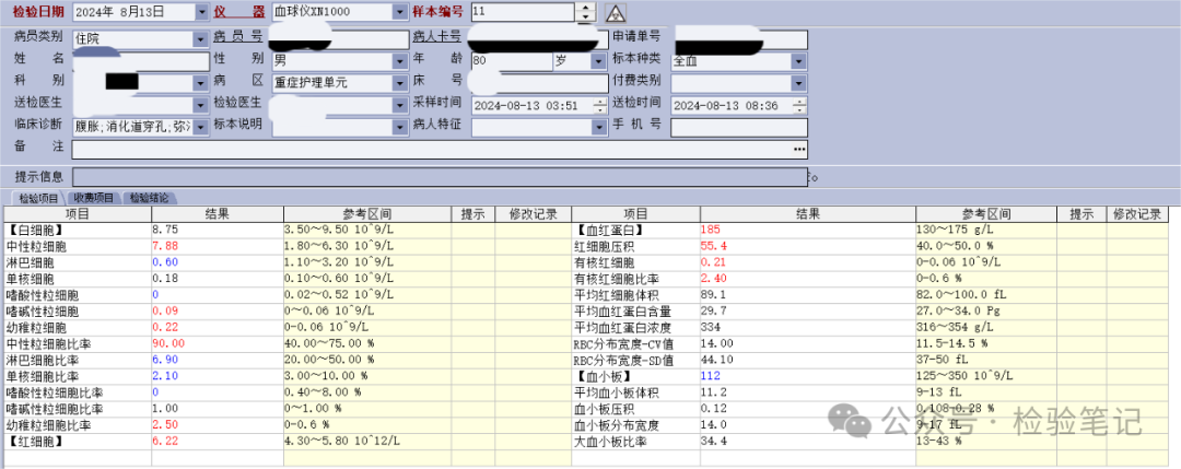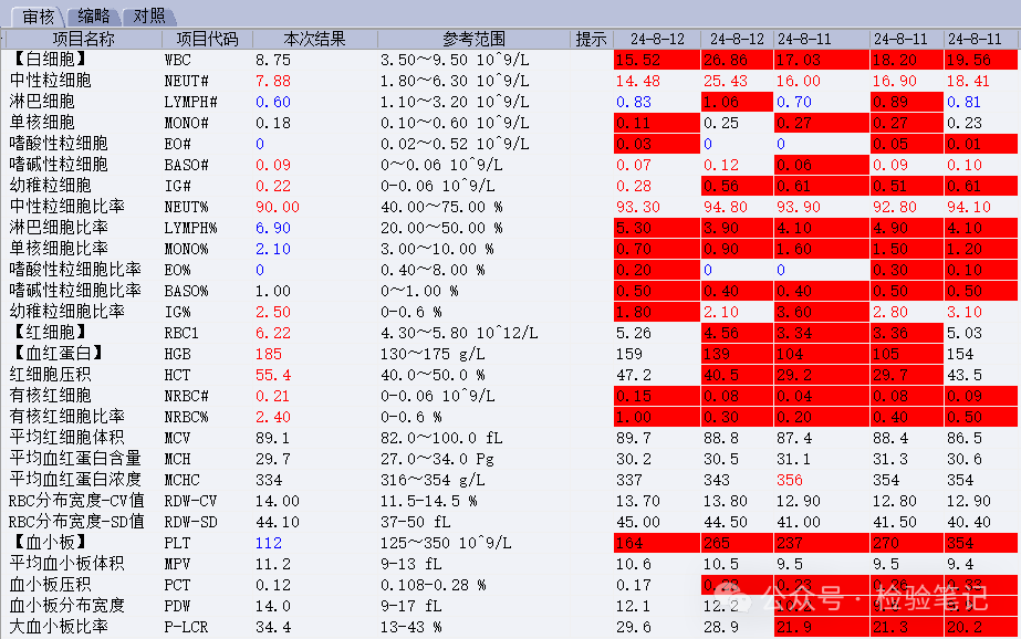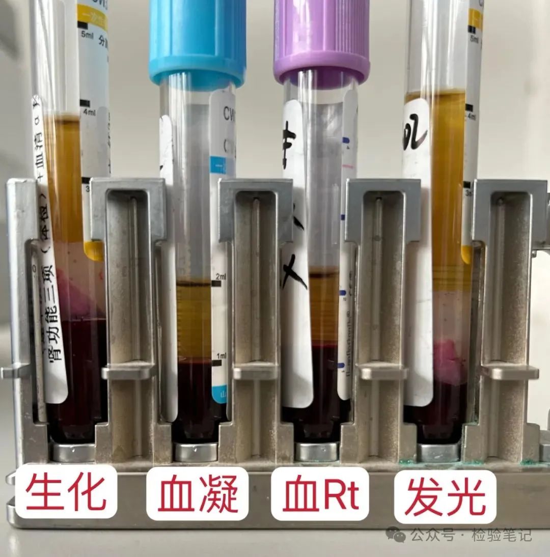 前言 2月5日回来上班第一天,在审核某患者血常规结果时,发现血红蛋白突然之间升高了,前一天HGB还是80g/L左右,今天却升至110g/L,查询医嘱,未见输血申请。 于是,电联告知护士站,需重新采集标本复核。 此时同事告知前几天有一次临床主任就质疑检验科的HGB结果不准,听到这,我大概明白什么原因了。 这事的根源在于检验前的操作规范,也让我想起之前的两个案例,今天就分享出来一起看看。 案例一 这个案例其实在检验人声直播课11月29日晚上讲到过,熟悉的老师或许知道真相。 2024.4.27,男,67岁,重症医学科,临床诊断:呼吸衰竭,血常规数据中提示 HGB 36g/L(危急值)!!! 但是LIS展示的历史数据显示,患者昨天(4.26日)HGB有70g/L呢。 HGB突然之间的下降,且跌幅将近一半了,是急性大出血?好像有点符合,WBC、PLT也符合应激性的改变,光看数据盲猜的话,我会想术后大出血可能。 在这里你还需要注意另外一个小指标:MCV,MCV很稳定,几乎没啥变化,说明该患者的血样应该是没抽错,初步排除护士采样错误,因为同病区、相邻床位的患者其MCV值很接近的可能性太小了。 (题外话,看MCV变化也可以排除上机错号等原因,部分医院可能是双人双岗,如检测上机岗、审核报告岗分开) 对于这个危急值,肯定是不能急于报告的,需要了解患者情况再定论。进入病历系统找找线索,看看患者到底是出了什么意外。 病历记录并未提示患者出现呕血、大出血、手术相关描述,查看医嘱,没有发现使用什么特殊药物(止血药、急诊手术医嘱等)。 到这一步,我已基本确定这是一个假性HGB危急值。 电联临床,告知需重新采血。 重新采血后,HGB为85g/L,与之前的HGB 70g/L虽然有一定差距,但至少不像之前的危急值了。 对比结果: (复查前)WBC 23.20×10⁹/L,Neu 94.4%,RBC 1.2×10¹²/L,HGB 36g/L,MCV 90 fL,PLT 735×10⁹/L (复查后)WBC 21.78×10⁹/L,Neu 93.3%,RBC 2.78×10¹²/L,HGB 85g/L,MCV 88.5 fL,PLT 662×10⁹/L 发现没,RBC和HGB差距特别大,这就是“红系消失术”,该如何做到这一完美的“表演”数据呢,只需要采血时候使用20mL注射器、并且采集后,放置一段时间,就可以。 案例二 2024.8.13,男,80岁,临床诊断:腹胀、消化道穿孔、弥漫性腹膜炎。 血常规结果,WBC 8.75×10⁹/L,Neu 90%,RBC 6.22×10¹²/L,HGB 185g/L,MCV 89.1 fL,PLT 112×10⁹/L 80岁老年人,HGB 高达185g/L,第一反应这个结果不可信,年轻人的HGB有时都达不到这水平,除非该患者是乳糜血或者输注了长链脂肪乳。 对比历史数据,就更加确定HGB是假性升高了。 LIS系统显示8月12日(昨天)WBC 15.52×10⁹/L,Neu 93.3%,RBC 5.26×10¹²/L,HGB 159g/L,MCV 89.7 fL,PLT 164×10⁹/L 其实这个HGB 159g/L我觉得也不可信,不是自己审核结果,有些事也无法完全把控。 通过查看历史HGB结果,个人觉得 HGB 104g/L左右才是可信且符合老年人血象。 既然自己遇到了HGB 185g/L,总得出手干预一下,电联临床重新采血复查,后续HGB为 118g/L,并在备注写好“重采后”字样。 复查后再对比下历史结果,嗯,HGB真是起起伏伏。 由于重症患者会每日复查血常规及生化,既然血常规采样不规范导致HGB差别大,那疑问来了,生化结果影响大吗? 查看生化数据及历史结果对比,发现竟然对生化数据影响不大,想想也是,生化检测的是血清或血浆,只要有一定量即可做出来,至于红细胞是多是少,又不影响生化结果。 而血常规检测的是全血,RBC、HGB检测结果与采血管里的红细胞多了、少了有直接关系啊。 想到这里,就突发灵感,何不把该患者今天所有的标本都离心对比一下呢。 收集该患者今天生化、血凝、血常规、发光,四管标本。 这顿时就看出差距来了。 不明显?看不什么门道?那好吧,我来标注一下。 红色框:离心后的压积红细胞 绿色框:血清或血浆量 生化管、发光管,我们采用的是带分离胶的采血管,所以分离胶高度需要排除。 大致比对一下压积红细胞与血浆/血清高度,发现生化管、血凝管的比例大约是1:1,而血常规管明显是红细胞多了一些,这就解释了难怪最开始的RBC、HGB升高这么多。 但是发光管的比例跟前三管就差别大了,明显是血清/压积红细胞比例大约为2.2~2.3:1,这说明发光管是注射器最后注入的血液。 案例分析 基本上HGB起起伏伏的血象,均来源于重症医学科,我们知道在此科室的患者比较危重,身上插管较多,而每日或隔日又需要采血复查情况如何,在这种情况下,护理上并不会每次更换不同部位静脉穿刺采血,只有一个可能:留置针上留取血液标本。 由于留置针有时会使用少量肝素抗凝封管,在采血前,会提前将封管内的肝素及少量血液流出舍弃。 接着,再用20mL注射器(舍弃针头)从留置针抽取一定量血液(根据采血管数量而定,如EDTA管、枸橼酸钠管均需要2mL,生化或发光管则3~4mL)。 此时到了最关键的一步! 由于是单人操作,抽取完一定量血液后,将注射器放置一旁,重新封管等一系列护理操作,此时时间大致已过去3分钟左右。 不要小瞧这一点点时间,注射器里的血液因为平放、静置缘故,会出现红细胞沉降现象,导致注射器里面上层血清多、红细胞稀薄,下层红细胞多、血清少。 又到了最关键一步~ 这个时候,如若注射器不混匀,直接注入血液到各个采血管内,那么前面 的采血管必然出现红细胞与血清差不多、或者红细胞量多于血清量的情况,而最后一个采血管必然出现红细胞少、血清量多。 当把这个现象理清之后,案例一二自然就能顺利推断出因果。 在这里需要特别注意一个情况:如果患