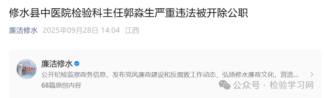 9月28日,修水县纪律检查委员会发布消息称,修水县中医院检验科主任郭淼生严重违法被开除公职。 通报称,郭淼生身为公职人员,背弃初心使命,甘于被“围猎”,无视中央八项规定精神,收受可能影响公正行使公权力的礼品,接受可能影响公正行使公权力的旅游、娱乐等活动安排;违反廉洁要求,违反规定从事营利性活动;利用职务便利为他人谋取利益,非法收受他人财物。 郭淼生严重违反中央八项规定精神和廉洁要求,同时构成严重职务违法并涉嫌受贿犯罪,且在党的十八大后不收敛、不收手,其行为严重违犯了国家法律法规,应予严肃处理。依据《中华人民共和国监察法》《中华人民共和国公职人员政务处分法》等有关规定,经修水县纪委常委会会议研究,由修水县监委给予其开除公职处分;没收其违法所得;将其涉嫌犯罪问题移送检察机关依法审查起诉,所涉财物一并移送。值得关注的是,据修水县纪委监委官网于8月26日所发布的通报,这名检验科主任是在任的情况下主动投案的: 小编还注意到,该院原党委副书记、院长在今年年初已经落马,并且还被县纪委监委作为典型进行了公开通报: 修水县中医院原党委副书记、院长胡某某违规收受礼品礼金、接受可能影响公正执行公务的宴请等问题。 2013年至2024年,胡某某在担任修水县人民医院副院长以及修水县中医院院长等职务期间,多次收受管理服务对象所送高档烟酒、高档补品、现金、超市储值卡等礼品礼金,折价共计85万余元;多次借用管理服务对象车辆供其个人使用;将本应由个人支付的家属看病治疗费、演唱会门票及家人游玩食宿费等3万余元费用由管理服务对象支付。胡某某还存在其他严重违纪违法问题,被开除党籍、开除公职,涉嫌犯罪问题被移送检察机关依法审查起诉。 公开资料显示,修水县中医院成立于1986年,2014年被评为国家三级乙等中医医院,是江西中医药大学、赣南医学院、九江学院、江西中医药高等专科学校、九江卫校等多所院校的教学实习基地,也是江西省首批5家县级三级中医院之一。目前医院占地面积42亩,总建筑面积44395平方米,编制床位497张,开放床位655张。 值得注意的是,官网显示:2024年医院分批次对中层以上干部进行廉政谈话,主动约谈20人次。组织职能科室开展规范医疗行为、违规使用医保基金、行风作风等专项整治5次。将党风廉政建设和行风建设纳入科室考核内容,制定四个方面13条考评细则,与医院绩效考核管理挂钩,建立奖惩机制,按月跟进考核。2024年累计拒收红包现象91余起,金额4.38万余元。 |