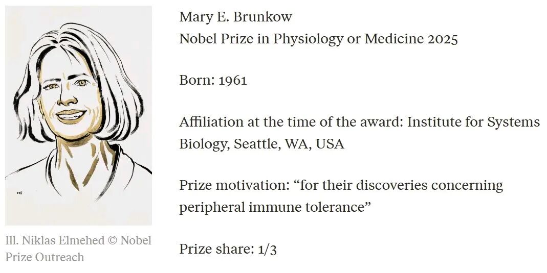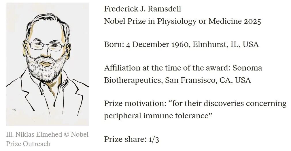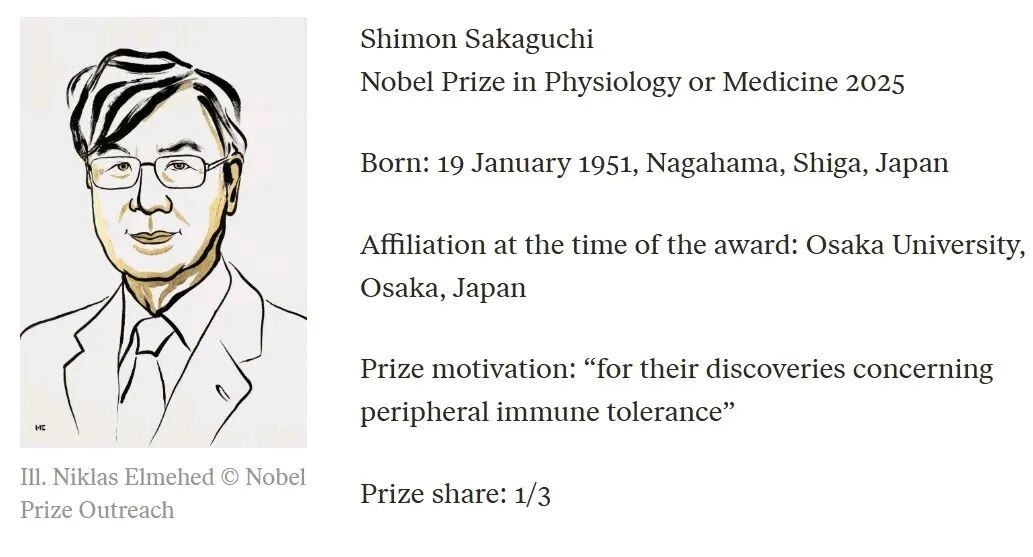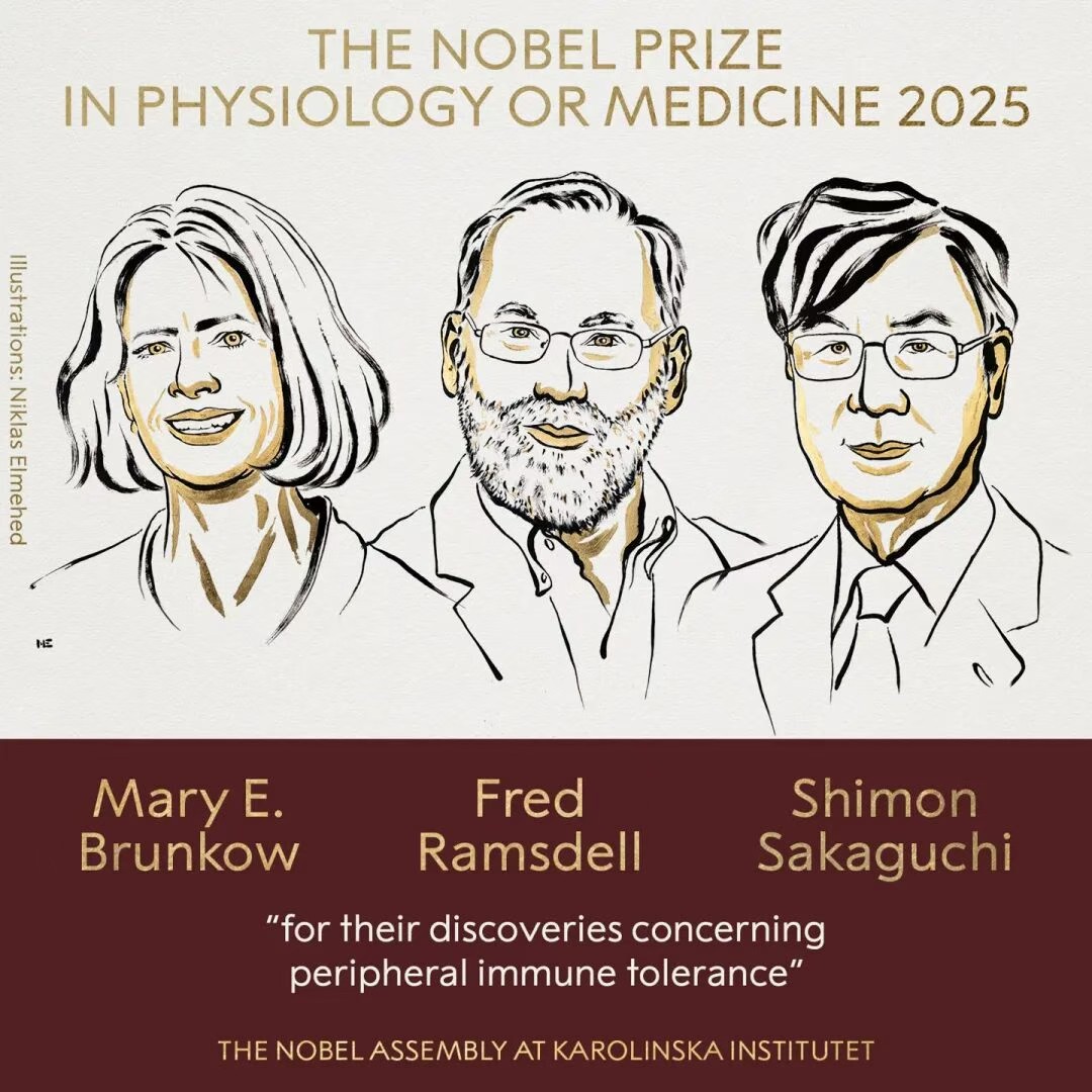 2025 年 10 月 6 日北京时间 17 时 30 分许,3 位科学家 Mary E. Brunkow(美国)、Fred Ramsdell (美国)和 坂口志文(Shimon Sakaguchi,日本)因在外周免疫耐受方面的发现,获得 2025 年诺贝尔生理学或医学奖。