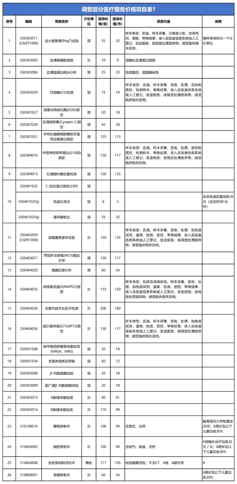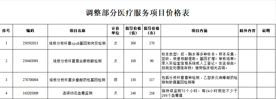 2025 年 10 月 9 日,河北省医疗保障局发布《关于调整部分医疗服务价格项目的通知》,明确对血小板聚集(PAgT)试验、血清果糖胺测定等共22项检验项目的费用进行调整,进一步优化医疗服务价格结构。 2025 年 9 月 19 日发布的《关于调整部分医疗服务项目价格的通知》,该通知为落实国家医疗保障局《关于开展医疗服务价格规范治理(第六批)的通知》要求,针对性下调4 个检验项目价格,具体包括:连续动态血糖监测、结核分枝杆菌 rpoB 基因和突变检测、结核分枝杆菌复合群核酸检测、结核分枝杆菌多重耐药性基因检测,切实减轻相关患者医疗费用负担。