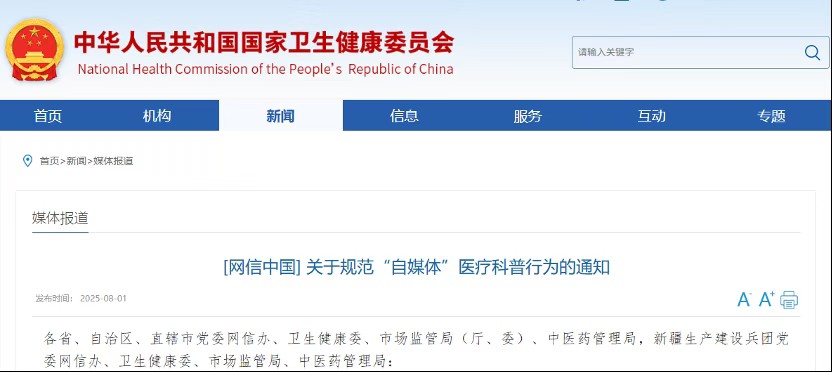 8月1日,中央网信办、国家卫健委、市场监管总局和国家中医药管理局四部门联合发布《关于规范“自媒体”医疗科普行为的通知》(下称《通知》)。
