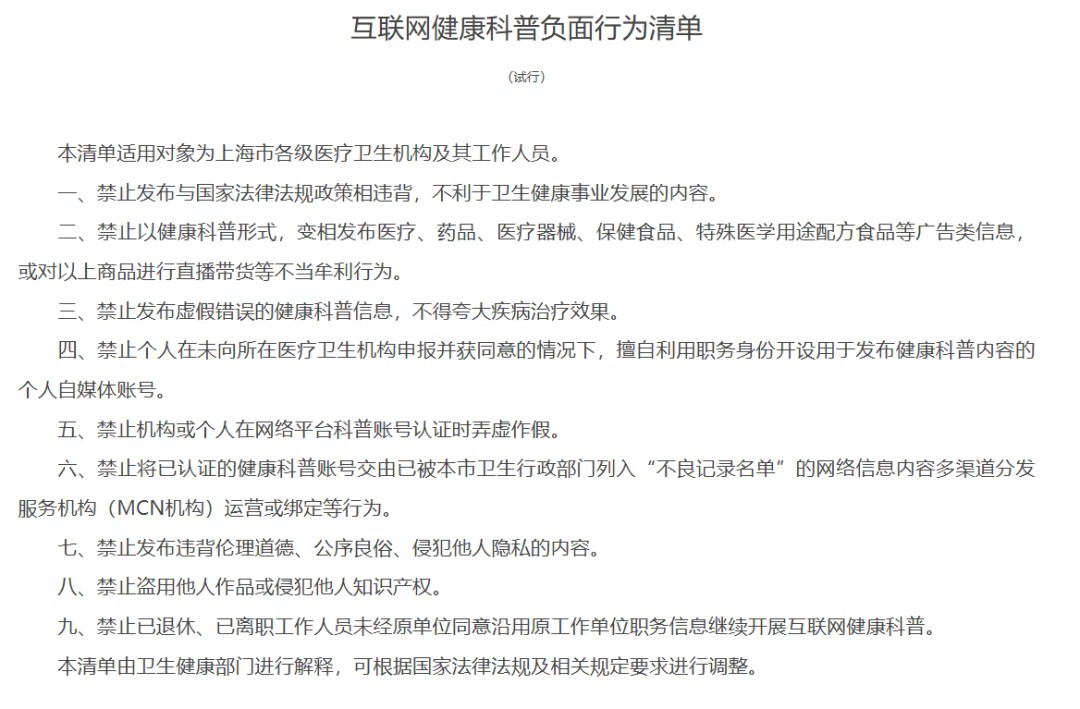 在政策与法规层面,很多地方已出台规范性文件予以规制,如上海市、四川省等地区出台的《互联网健康科普负面行为清单(试行)》,通过划定禁止性规定,为健康科普内容立规矩、树标准。