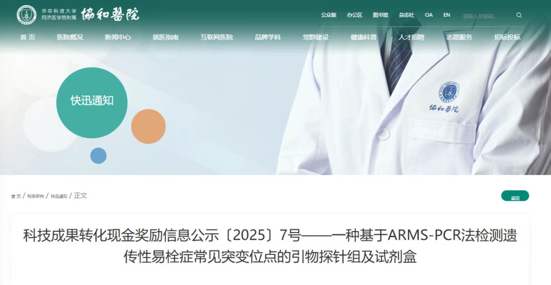 0 试剂盒专利转化1200万 5位检验人获48万现金奖励 近日,华中科技大学同济医学院附属协和医院科研处发布科技成果转化现金奖励公示。 该院胡豫教授团队研发的"一种基于ARMS-PCR法检测遗传性易栓症常见突变位点的引物探针组合及试剂盒"发明专利成功转让,转化收入达1200万元,第一笔费用60万元已于2025年2月到账。 根据《协和医院科技成果转化管理办法》,团队5名成果完成人共获得现金奖励48万元,其中胡豫教授作为成果完成人获得28.8万元,现金奖励拟发放时间为2025年10月。 根据华中科技大学同济医学院附属协和医院官网信息显示: 该专利发明人为胡豫/邓君/唐亮/丁雅洁/梅恒,专利提供了一种基于ARMSPCR法检测遗传性易栓症常见突变位点的引物探针组合及试剂盒,属于生物检测鉴定技术领域。 本发明中的引物探针组合序列,如SEQ ID NO.1~SEQIDNO.34所示,可检测PROC、PROS1、F5、THBD、SERPINC1五种基因的11个常见突变位点。 使用该引物探针组合制成的试剂盒操作简便,可在医院及检测中心广泛开展,并可在23小时内快速出具报告,所针对的11个突变位点可直接用于遗传性易栓症的诊断,也可以作为临床各类血栓风险评分的补充。本发明中的方法明显优于二代测序法、多态性位点或者风险预测法等其他方案,因此可更好的适用于临床。 该专利的主要发明人胡豫教授,是我国血液疾病治疗领域的代表学者。他不仅在弥散性血管内凝血诊断方面创立了具有中国特色的“积分法”,还在CAR-T细胞治疗领域取得了突破性进展,为血液肿瘤患者提供了“一针清除癌细胞”的创新治疗方案。值得一提的是,胡豫教授牵头的“血栓性疾病的早期诊断和靶向治疗”项目更是将我国血栓病的分子诊断率从0提高到了40%,并在2018年度获得国家科学技术进步二等奖。 根据此前公告,该成果是以普通转让的方式,拟以1200万元交易价格,转让给广州金域医学检验集团股份有限公司。 科技成果转化 医学领域科研工作者持续发力 科技成果转化是指为提高生产力水平而对科技成果所进行的后续试验、开发、应用、推广直至形成新技术、新工艺、新材料、新产品,发展新产业等活动。 那么何为科技成果?《促进科技成果转化法》第二条明确规定:科技成果,是指通过科学研究与技术开发所产生的具有实用价值的成果。职务科技成果,是指执行研究开发机构、高等院校和企业等单位的工作任务,或者主要是利用上述单位的物质技术条件所完成的科技成果。 近年来,国家大力倡导科技创新、科技成果转化。医学领域科研工作者持续发力,在疾病诊治技术方向逐渐形成自主创新的科技成果并转化落地,全国医疗领域正掀起一轮创新转化的研究潮流。 日前国务院印发的《要素市场化配置综合改革试点总体方案》强调“大力促进技术要素向现实生产力转化”,具体路径包括“支持相关高校和科研院所探索创新职务科技成果转化管理方式”“探索对重大战略项目、重点产业链和创新链实施创新资源协同配置”等。 以医疗卫生领域的科技成果转化为例,医学科技成果转化不仅是我国创新药械早期研发实现产业化、资本化的“命门”所在,更是大型公立医疗机构回归公益性的激励机制突破口,也是“专利养医”的一种体现。 相信在全国医工同行的共同努力下,会有越来越多有竞争力的自主知识产权成果涌现,助力我国成为世界医学科技强国。 |