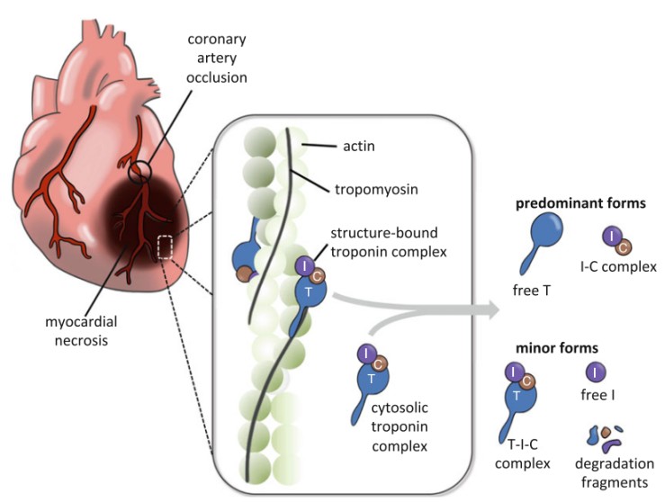 cTnI 是肌动蛋白抑制亚基,心肌亚型相对骨骼肌亚型约有 40% 的不同源性,所以心脏 cTnT 和 cTnI 是心脏独特的结构蛋白,是心肌细胞坏死的敏感和特异的生化标志物。