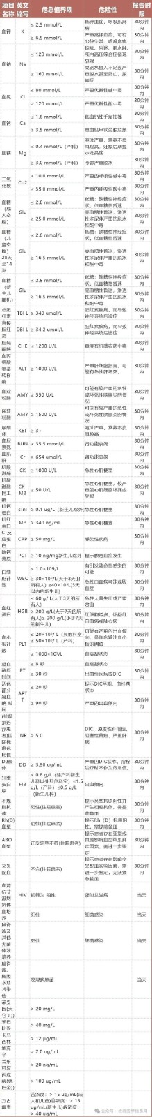 危急值结果与患者病情相符,必须通知主管医生第一时间进行干预。并做好相应的危急值登记。危急值登记本必须包括患者的姓名、性别、年龄、科室、床位等基本信息,还要有危急值项目名称、初检结果、复检结果、送检时间、结果回报时间、结果报告人、接报告人等信息。(报告时间精确到几点几分。这一点非常重要!) 常见实验室危急值一览表 |