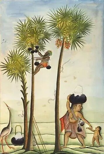 ![]() ▲ 在糖棕(Borassus flabellifer)的花序上收集糖汁。左边树上黑色的是装树汁的陶罐,右边树上偏红色的是糖棕的果实,其未成熟的胚乳也可以吃,在南亚和东南亚很多地方都能吃到。图源:wiki