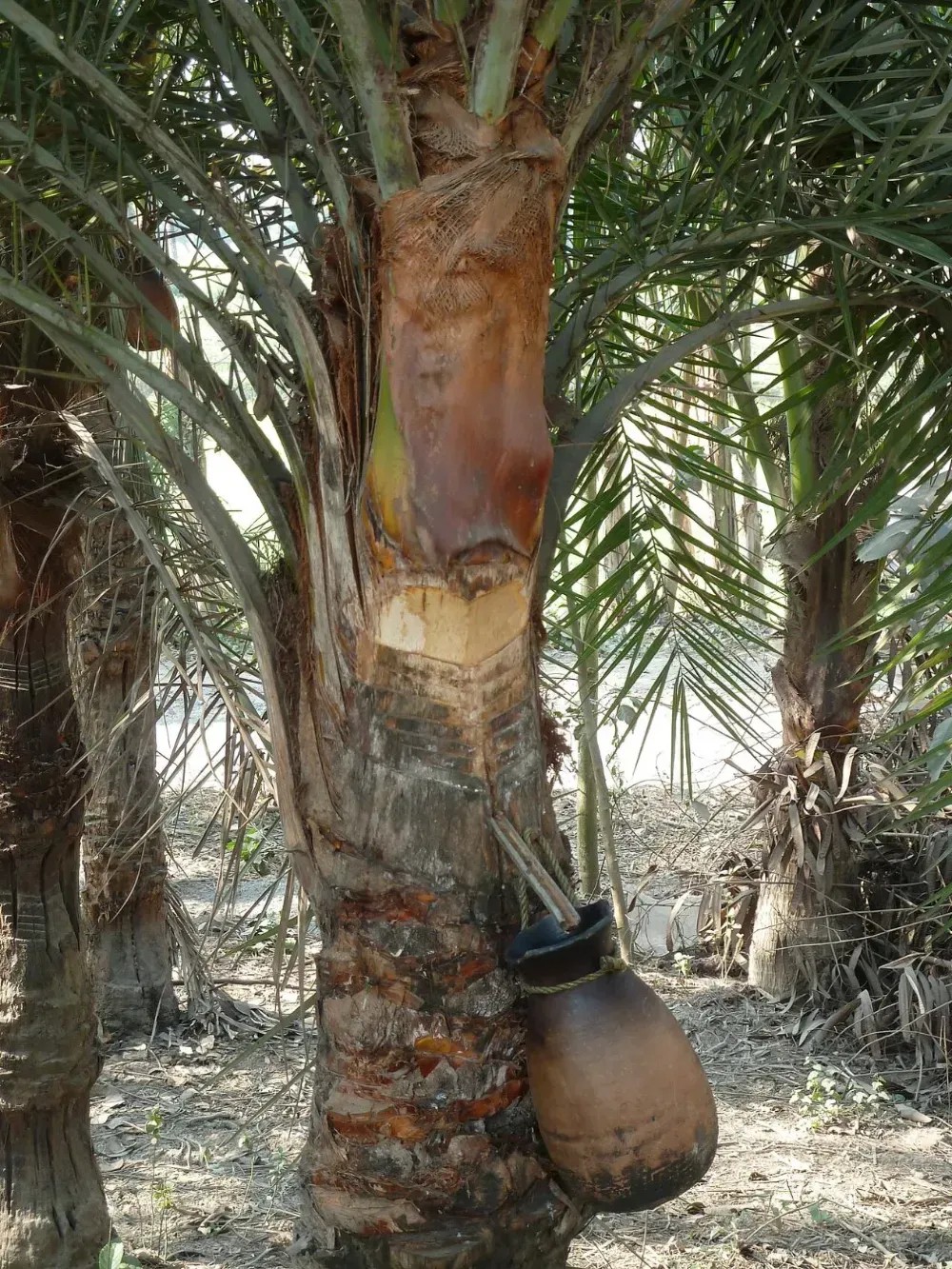 ![]() ▲ 印度西孟加拉邦用于采收糖汁的银海枣,注意引流条和罐子。图源:wiki