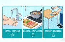 贝类等海产品务必彻底煮熟煮透,生熟食物分开处理,水果蔬菜用流水冲洗干净。