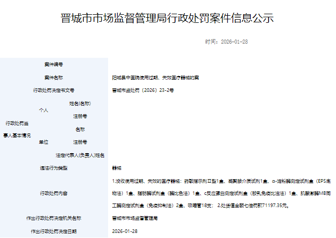 近日,晋城市市场监督管理局发布行政处罚信息,通报了阳城县中医院使用过期、失效医疗器械案。