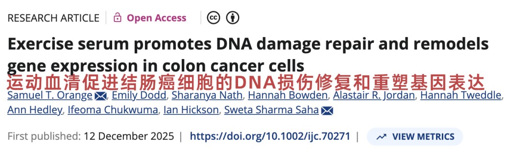 ①Exercise serum promotes DNA damage repair and remodels gene expression in colon cancer cells. Int J Cancer. Published online December 12, 2025. doi:10.1002/ijc.70271 ②2025-12-17医诺维《一次运动就能抗癌!最新研究:运动可改变血液成分,增强DNA修复能力,直接抑制癌症进展》 ③Brief bouts of device-measured intermittent lifestyle physical activity and its association with major adverse cardiovascular events and mortality in people who do not exercise: a prospective cohort study. Lancet Public Health. 2023;8(10):e800-e810. doi:10.1016/S2468-2667(23)00183-4. ④国家体育总局.《全民健身指南》 ⑤2019-04-09 健康时报《偶尔干点高强度体力活对心脏好》 |