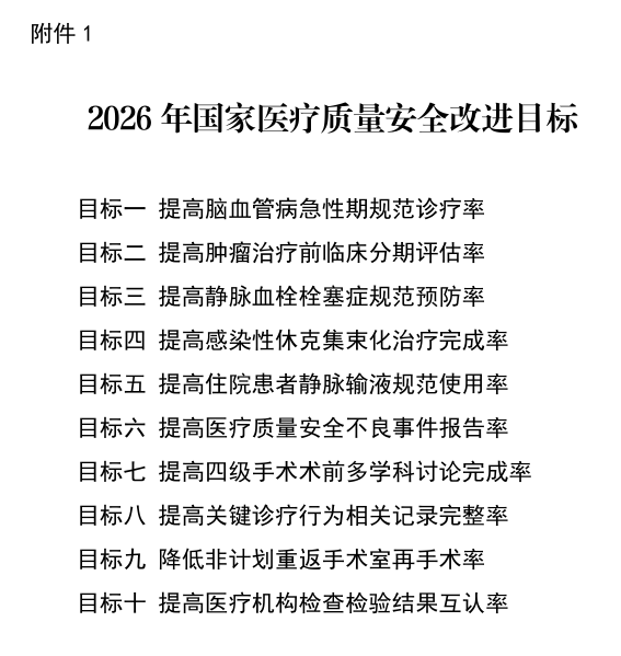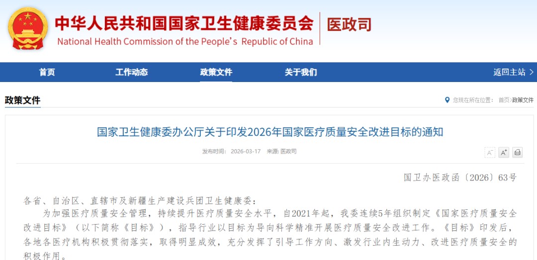 3月17日,国家卫健委医政司发布了《关于印发2026年国家医疗质量安全改进目标的通知》。