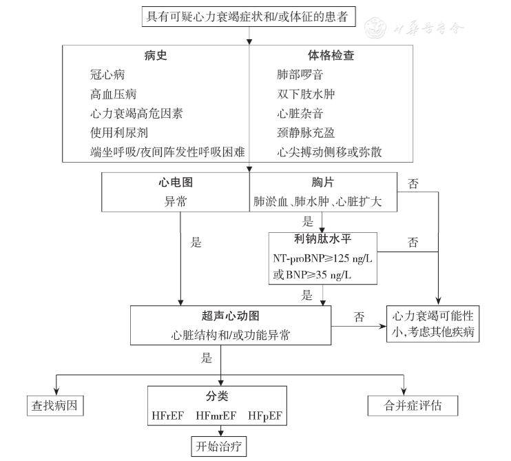 (1)利钠肽[B型利钠肽(B-type natriuretic peptide,BNP)或N末端B型利钠肽原(N-terminal pro-BNP,NT-proBNP)]测定:利钠肽检测推荐用于心衰筛查(Ⅱa,B)、诊断和鉴别诊断(Ⅰ,A)、病情严重程度及预后评估[10,11](Ⅰ,A)。出院前的利钠肽检测有助于评估心衰患者出院后的心血管事件风险[12](Ⅰ,B)。BNP<100 ng/L、NT-proBNP<300 ng/L时通常可排除急性心衰。BNP<35 ng/L、NT-proBNP<125>450 ng/L,50岁以上>900 ng/L,75岁以上应>1 800 ng/L,肾功能不全(肾小球滤过率<60>1 200 ng/L。经住院治疗后利钠肽水平无下降的心衰患者预后差。多种心血管疾病[心衰、急性冠状动脉综合征、心肌病变如左心室肥厚、心脏瓣膜病、心包疾病、心房颤动(房颤)、心肌炎、心脏手术、电复律、心肌毒性损伤等]和非心血管疾病(高龄、贫血、肾功能不全、睡眠呼吸暂停、重症肺炎、肺动脉高压、肺栓塞、严重全身性疾病、脓毒症、严重烧伤和卒中等)均会导致利钠肽水平增高,尤其是房颤、高龄和肾功能不全。脑啡肽酶抑制剂使BNP降解减少,而NT-proBNP不受影响。临床工作中应注意结合患者的病史进行分析。(2)心脏肌钙蛋白(cardiac troponin,cTn):推荐心衰患者入院时行cTn检测,用于急性心衰患者的病因诊断(如急性心肌梗死)和预后评估(Ⅰ,A)。(3)反映心肌纤维化、炎症、氧化应激的标志物:如可溶性ST2、半乳糖凝集素3及生长分化因子15也有助于心衰患者的危险分层和预后评估,联合使用多项生物标志物可能是未来的发展方向[13,14,15,16]。